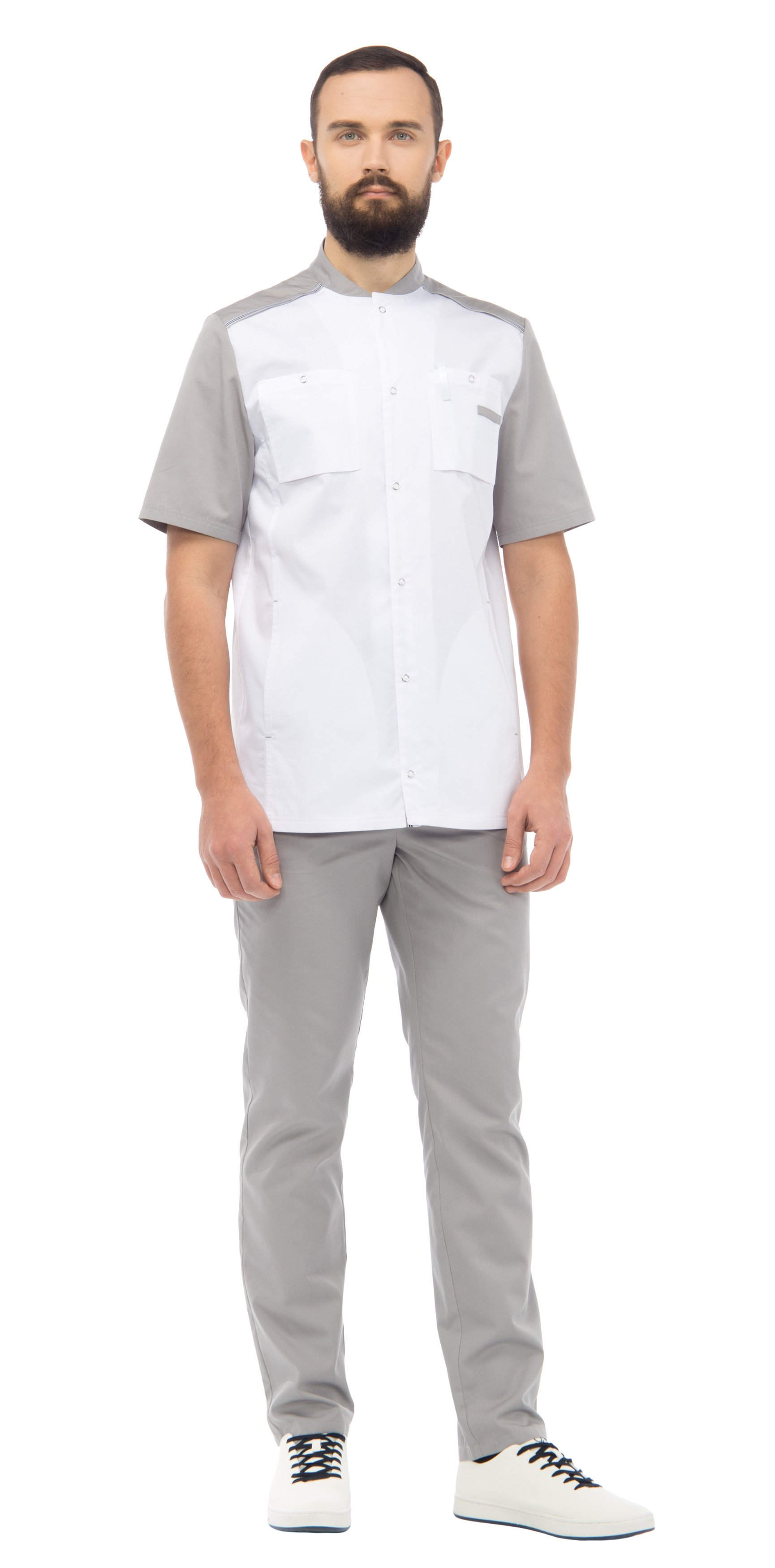 Блуза полуприлегающего силуэта с центральной застежкой на кнопки длиной до линии бедер. Кокетки переда и спинки из отделочной ткани и борт с отделкой из декоративной тесьмы. Перед и спинка с отрезными боковыми частями. Нагрудные накладные карманы и нижние карманы в швах рельефов. На спинке в области лопаток - вставки из трикотажа для комфорта в движении. По низу спинки небольшие разрезы. Воротник – стойка. Рукава втачные короткие.