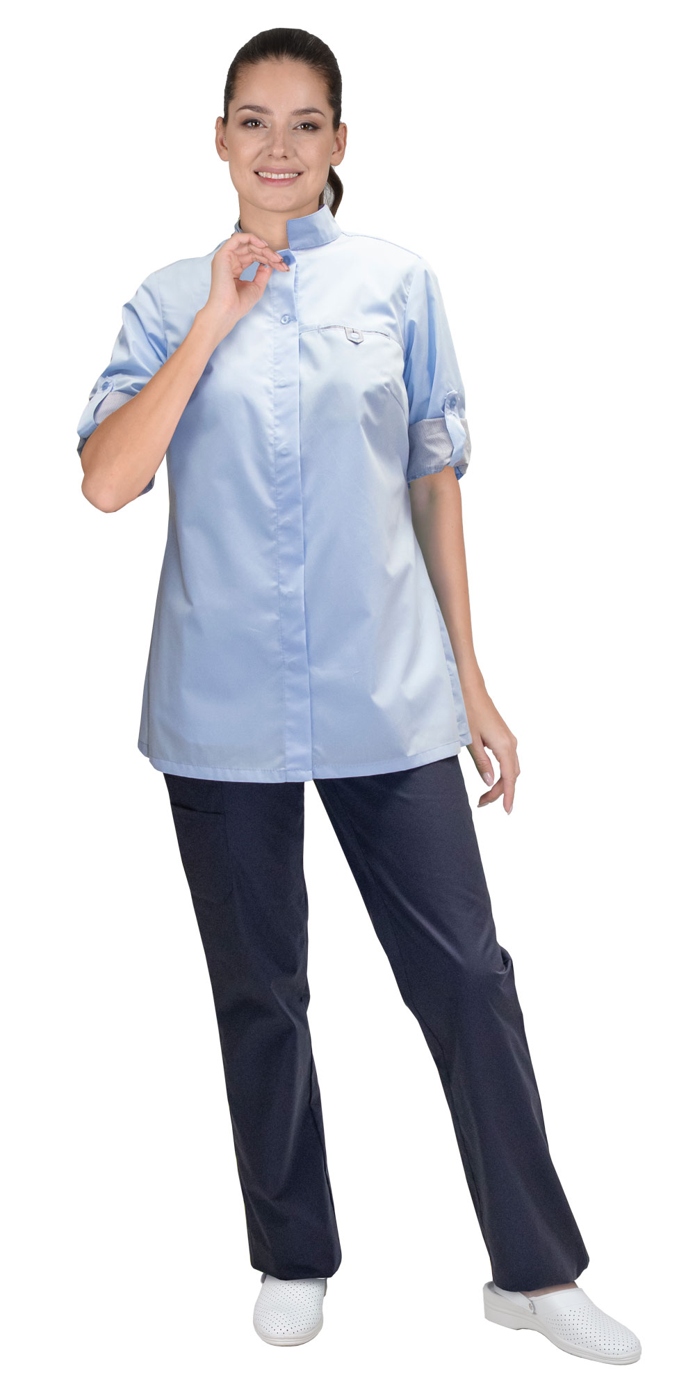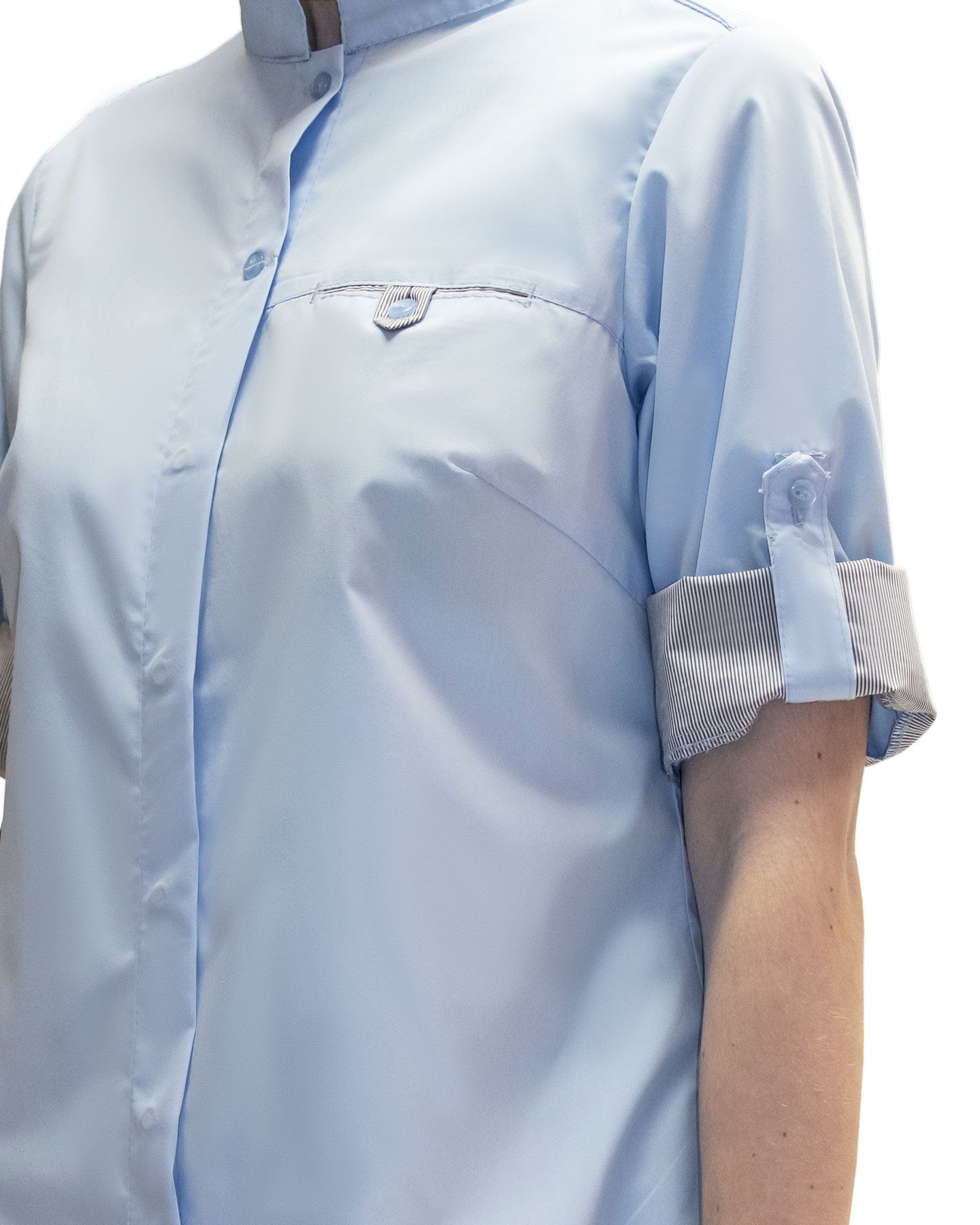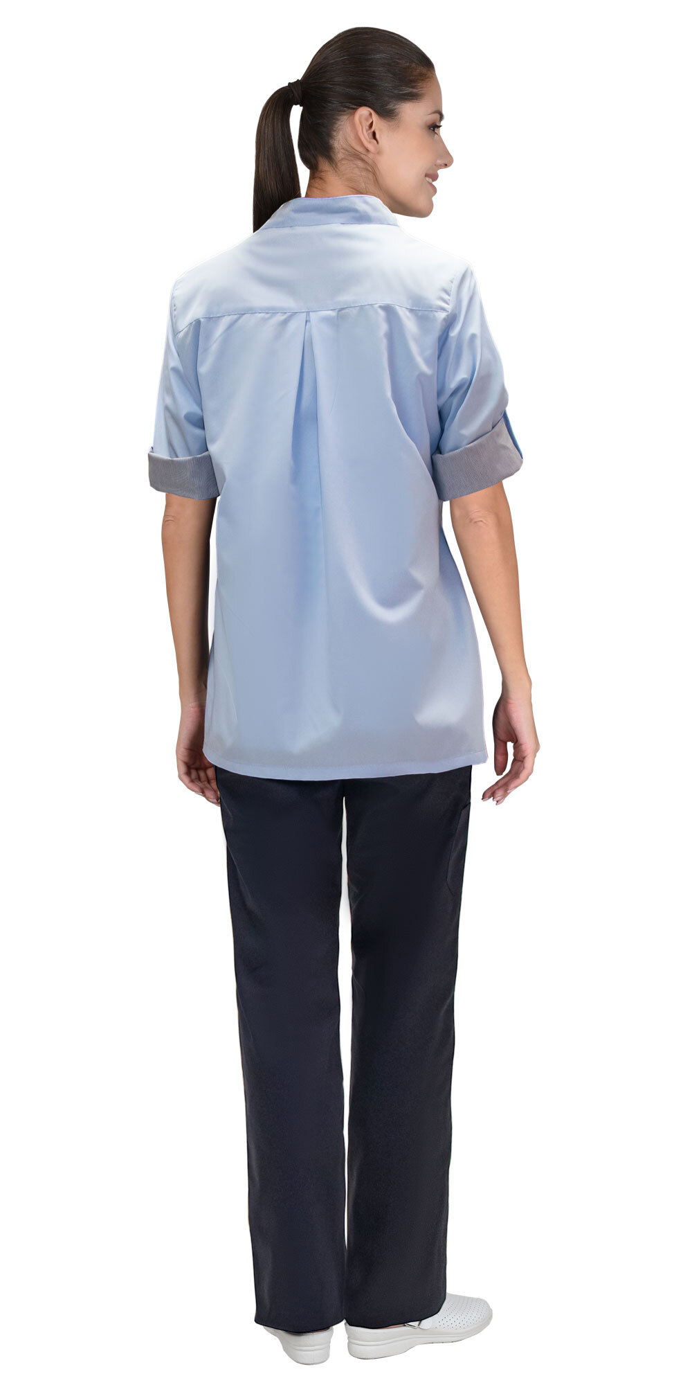 Блуза женская прямого силуэта с боковыми разрезами. Центральная застежка на 5 потайных кнопок и 2 верхние пуговицы для пристегивания фартука. Воротник стойка. Нагрудный карман на левой полочке. Рукава втачные, длиной ¾, с возможностью уменьшения длины и её фиксации при помощи хлястика и пуговицы. Подкладка кармана, внутренняя кокетка и отворот рукава выполнены из отделочной ткани в полоску.