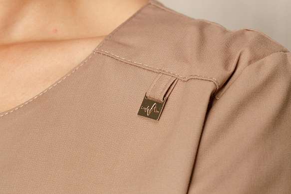 Женская хирургичка полуприлегающего силуэта. Фигурная горловина красиво подчеркивает линию шеи. Нагрудные, плечевые и талиевые вытачки обеспечивают идеальную посадку модели по фигуре. Внизу - удобные накладные карманы, а по бокам - разрезы, которые делают фасон куртки свободным, не сковывающим движений. На правом кармане размещен фирменный металлический ярлык. Рукава одношовные, втачные, короткие. В шве левой кокетки размещена шлевка из отделочной ткани, которую можно использовать для размещения бейджа. Ткань легкая и прочная, оптимальна по содержанию хлопка.