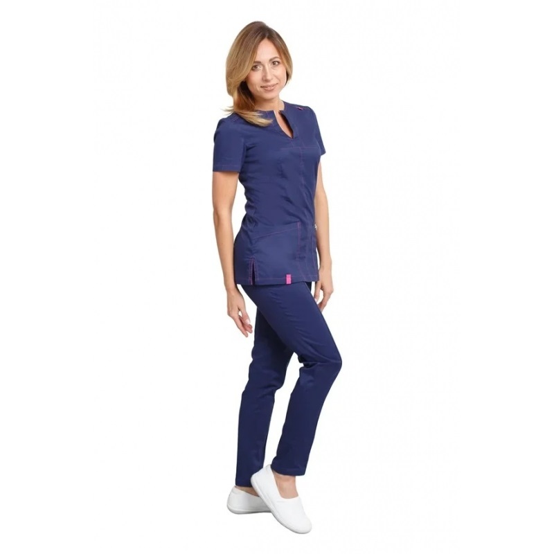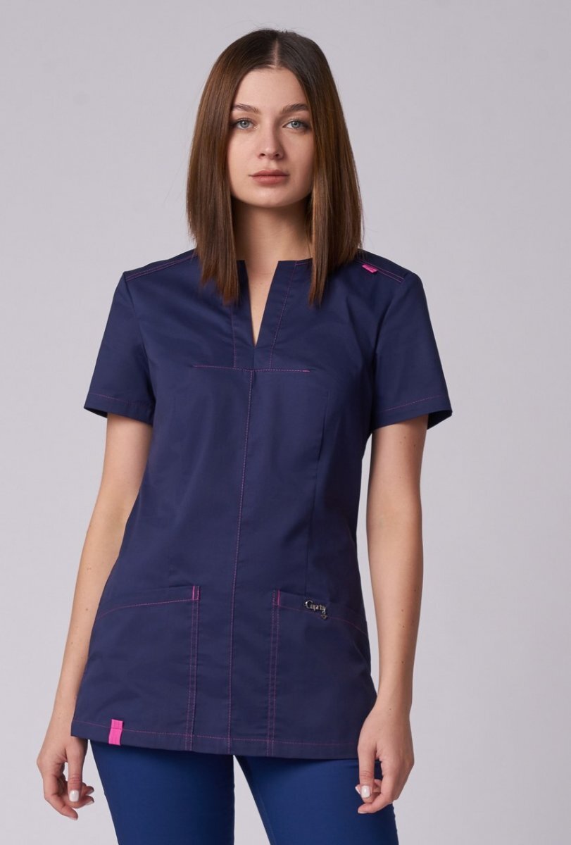 По швам кокеток, среднему шву полочки и спинки, карманам, низу рукавов и низу изделия, разрезам проложены отделочные строчки на контрасте с основной тканью.