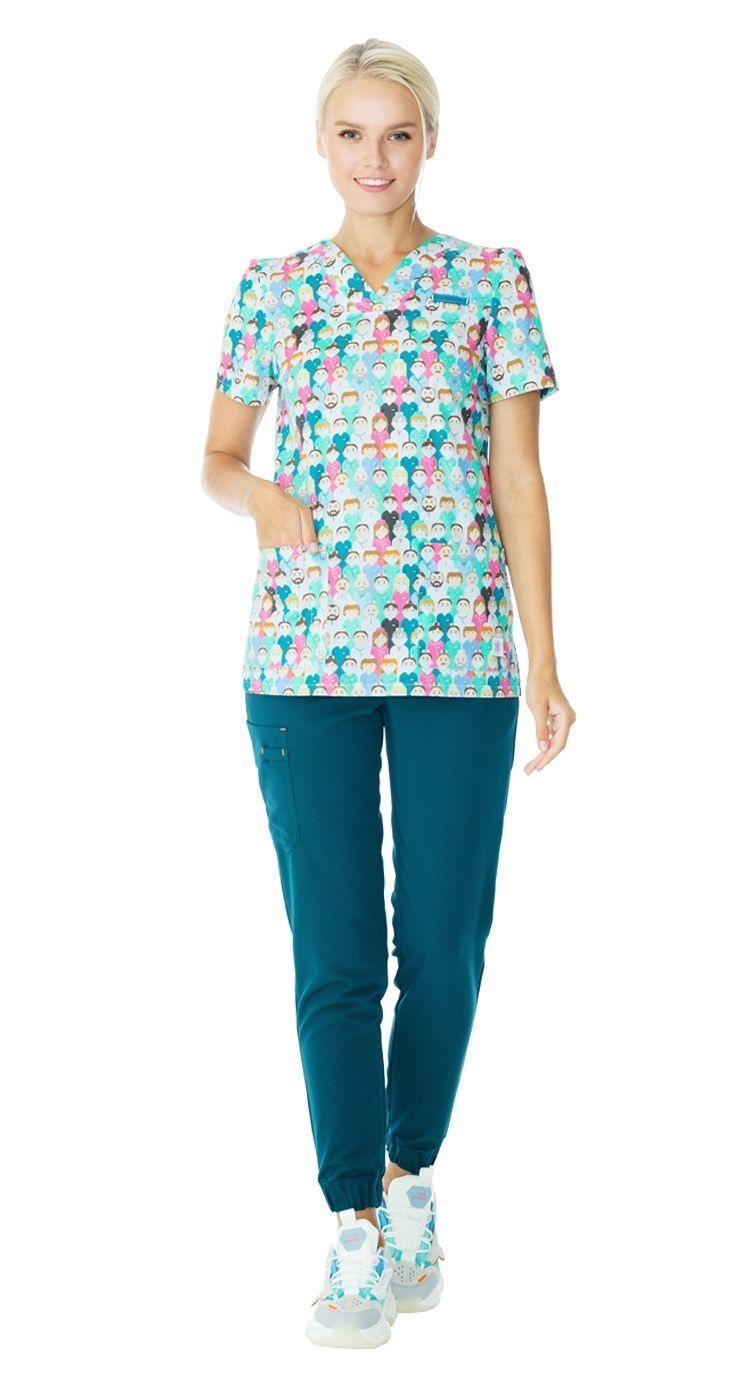 Блуза полуприлегающего силуэта. Перед с V-образной горловиной и нагрудными вытачками. На груди шлевка под бейдж или стетоскоп из отделочной ткани. Трапециевидная обтачка горловины спинки также из отделочной ткани. По низу блузы накладные карманы. На правом кармане отсек для ручки. Спинка с вытачками. Рукава втачные короткие. По низу боковых швов блузы разрезы.