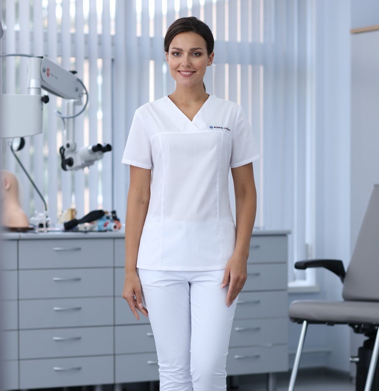 Модель хирургической куртки с классическим V- образным вырезом. 2 нижних глубоких кармана. Имеются разрезы в боковых швах. Рельефы полочки и спинки отстрочены отделочными строчками.