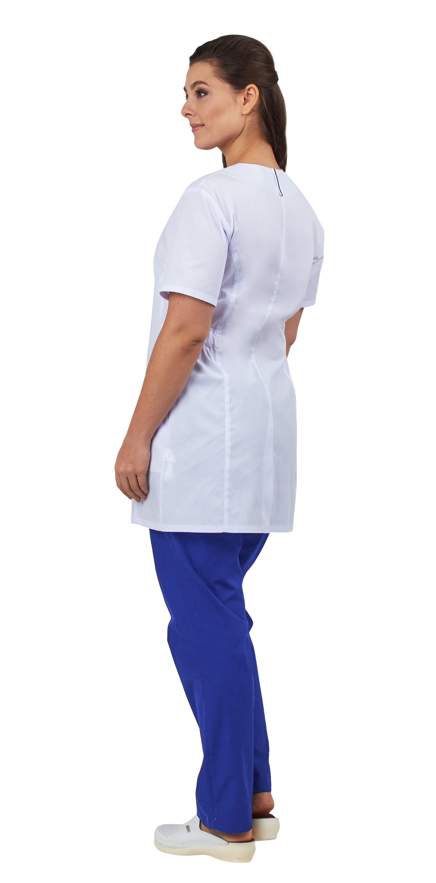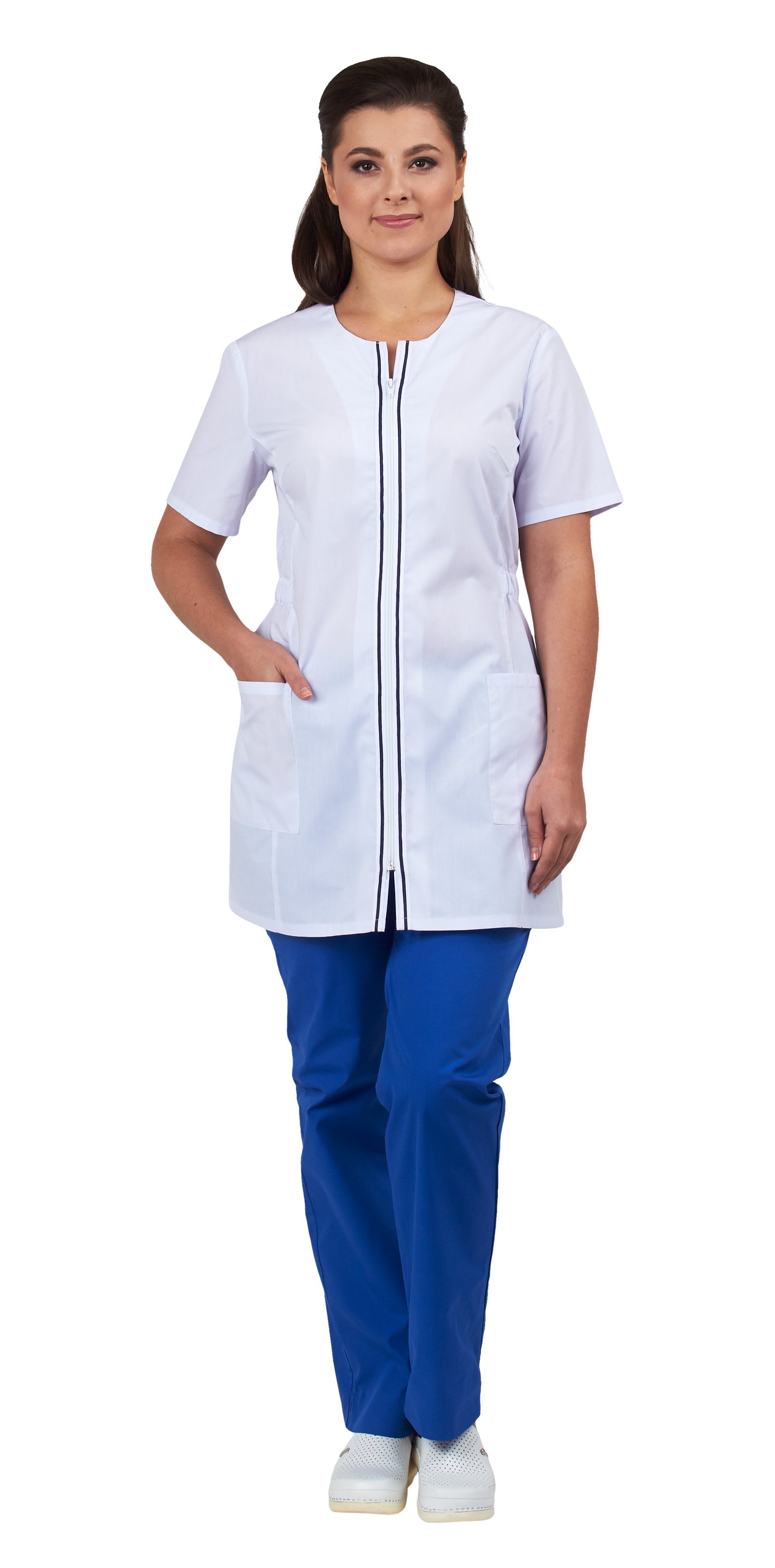 Блуза полуприлегающего силуэта до середины бедра с центральной застежкой на молнию и отделочной тесьмой вдоль борта. Горловина - округлая. На полочках рельефы и накладные карманы внизу с горизонтальным входом. На спинке рельефы, шлица в среднем шве, а также отделочная тесьма в верхней части спинки. В боковых частях изделия – кулисы с эластичной тесьмой по талии для регулировки объема. Рукав короткий, с отделочной строчкой по низу.