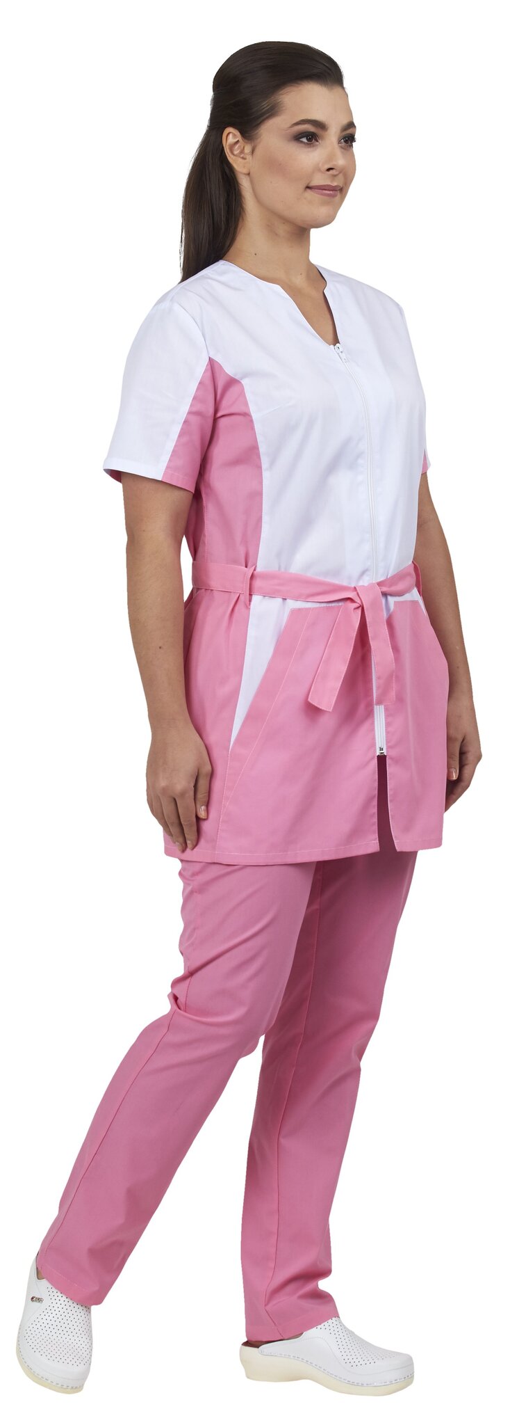 Блуза полуприлегающего силуэта до середины бедра с центральной застежкой на молнию. Горловина фигурной формы. Центральная часть переда из основной ткани белого цвета с рельефами и накладными фигурными карманами-кенгуру со скошенным входом из отделочной ткани. Центральная часть спинки из основной ткани. Боковые детали блузы из отделочной ткани с регулируемыми поясами на талии и шлевкой у переднего рельефа. Рукав короткий, нижняя часть рукава из отделочной ткани.