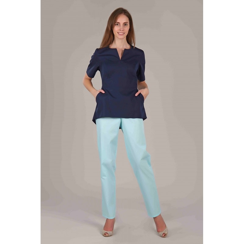 Блуза медицинская с коротким рукавом, приталенного силуэта. Без воротника, горловина-фигурная с разрезом впереди. На полочке фигурный втачной пояс, на спинке пояс завязывающийся он позволяет регулировать прилегание блузы по талии. Имеются два боковых кармана.