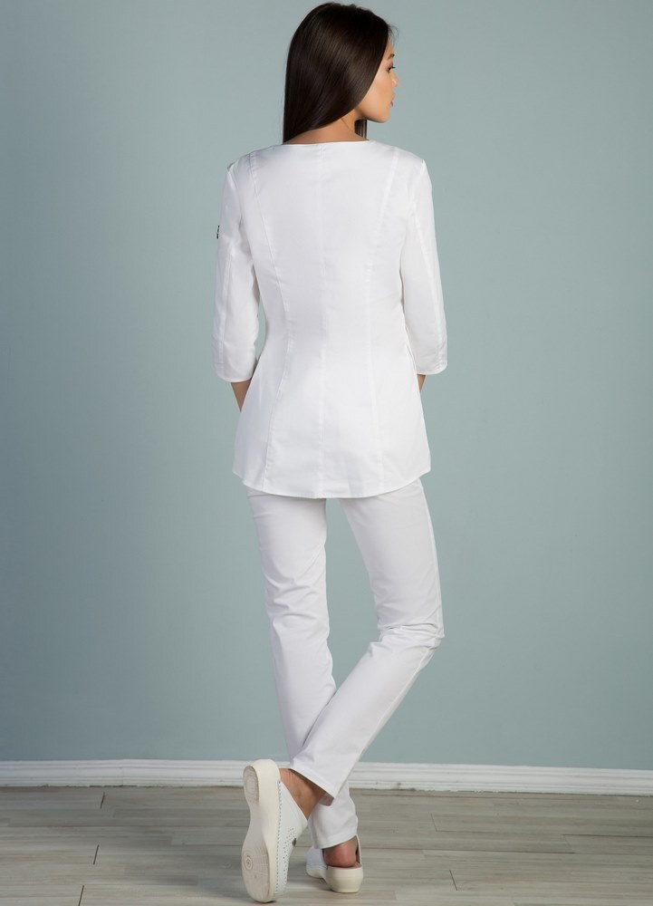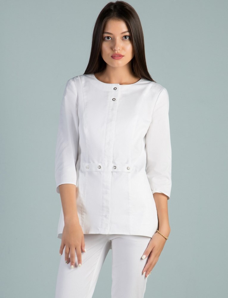 Куртка медицинская женская полуприлегающего силуэта, с комбинированной застежкой по планке борта: две сквозные кнопки , шесть потайных, четыре по декоративным патам по талии переда без воротника