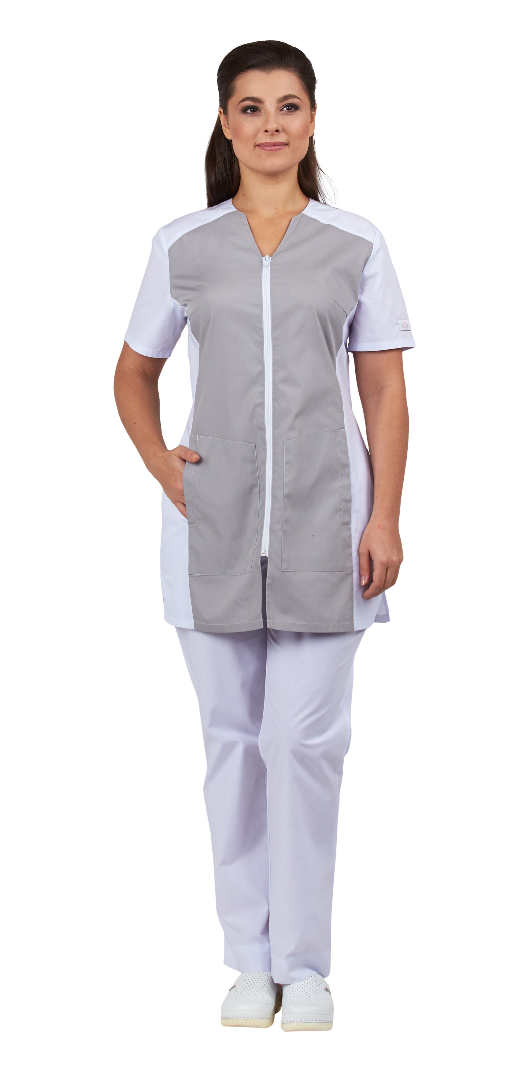 Блуза полуприлегающего силуэта удлиненная с центральной застежкой на молнию и небольшими разрезами в боковых швах. Вырез горловины – фигурный. Центральная часть переда серого цвета с накладными карманами с боковым входом. На полочках и спинке вертикальные рельефы, подчеркивающие изгибы женской фигуры. По талии центральной части спинки пояс из ткани серого цвета и шлевка для фиксации пояса и регулировки объема. Рукав короткий.