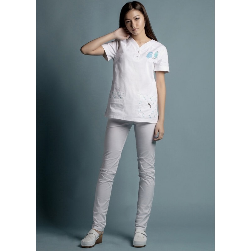 Перед с кокетками нагрудными вытачками. На левый боковой карман настрочен малый боковой карман, правый боковой карман состоит из двух частей: отделочной и основной. Вырез горловины V- образный,обработан планкой по переду ,застегивающаяся на две кнопки.