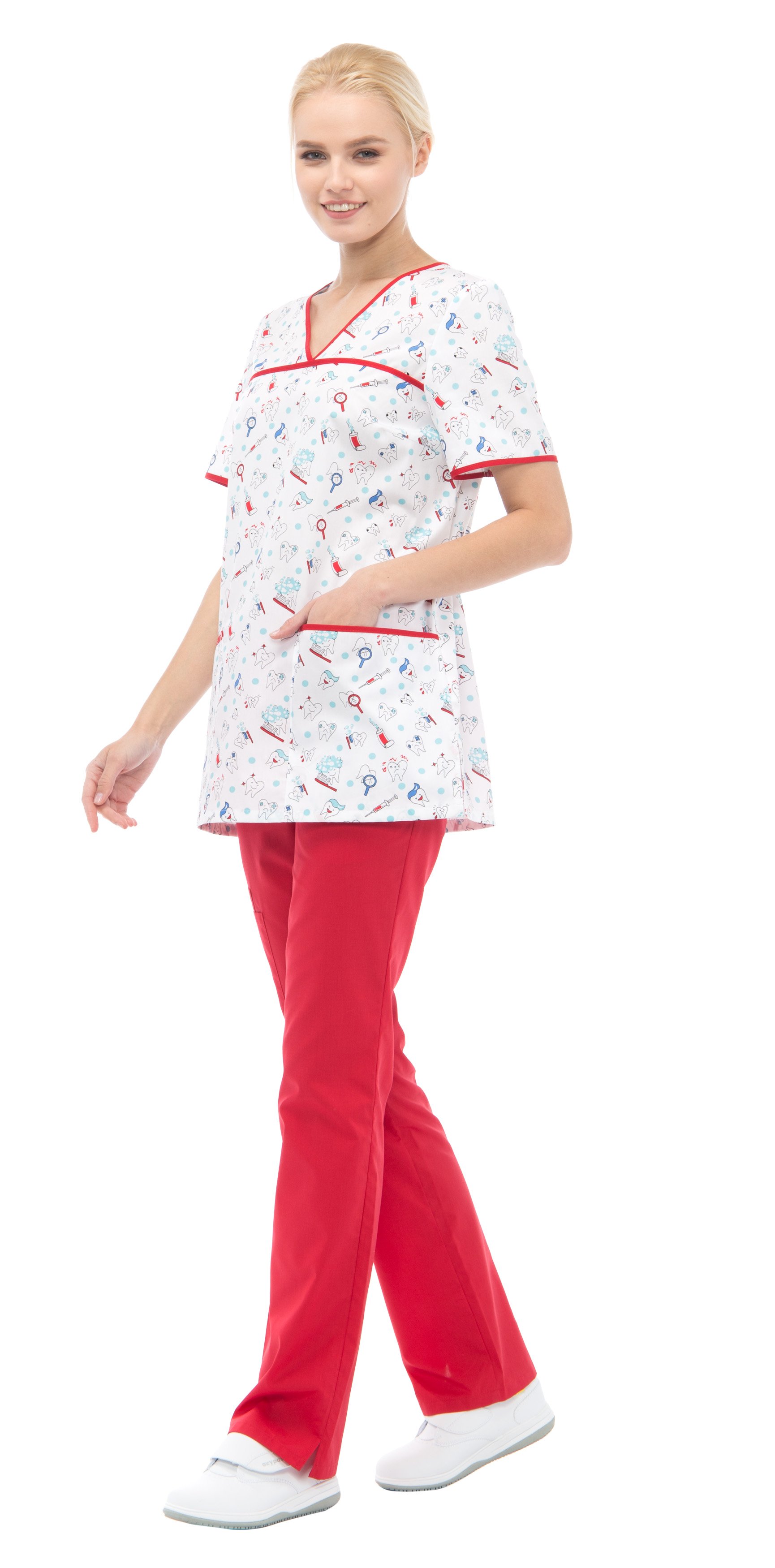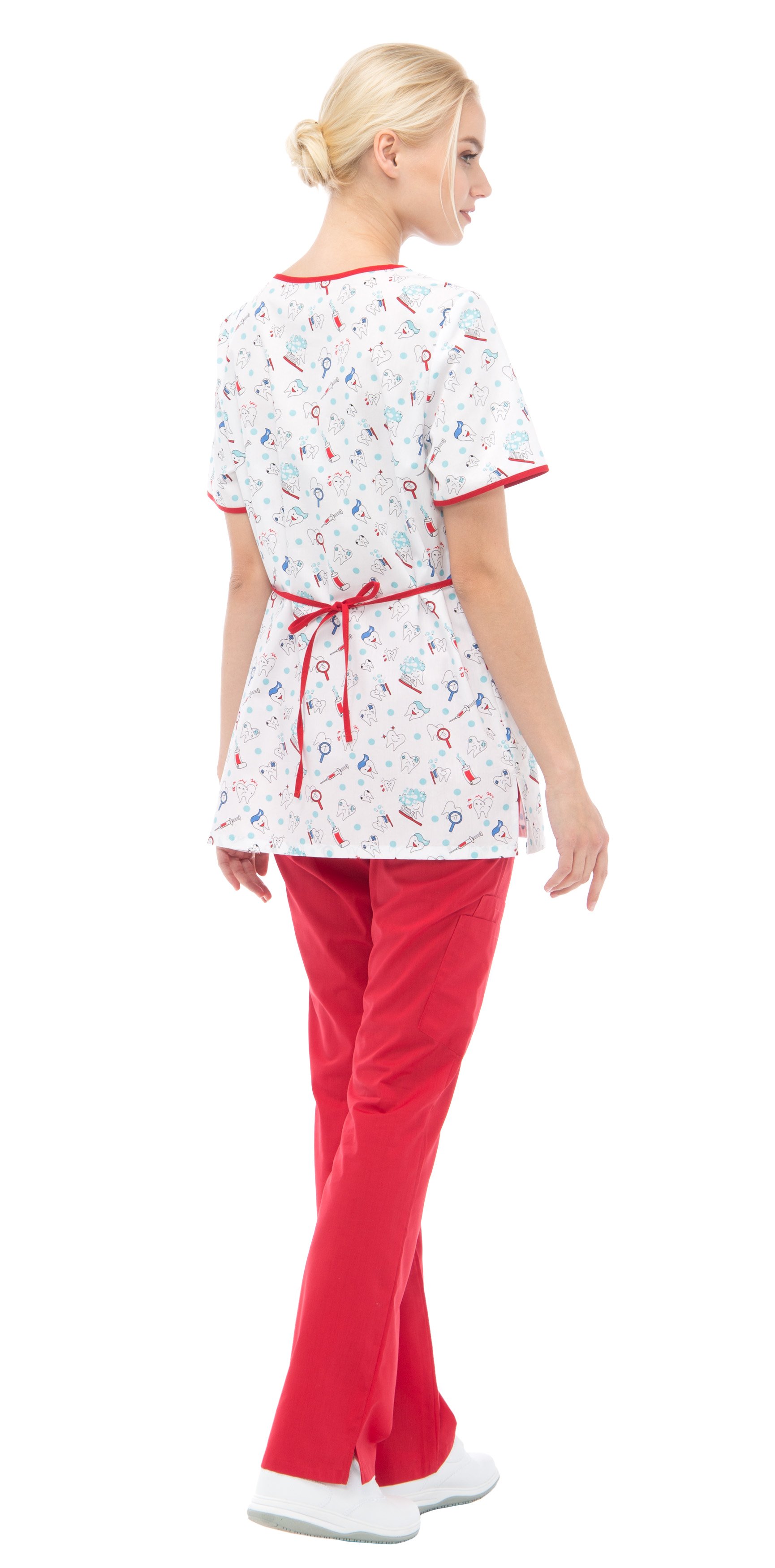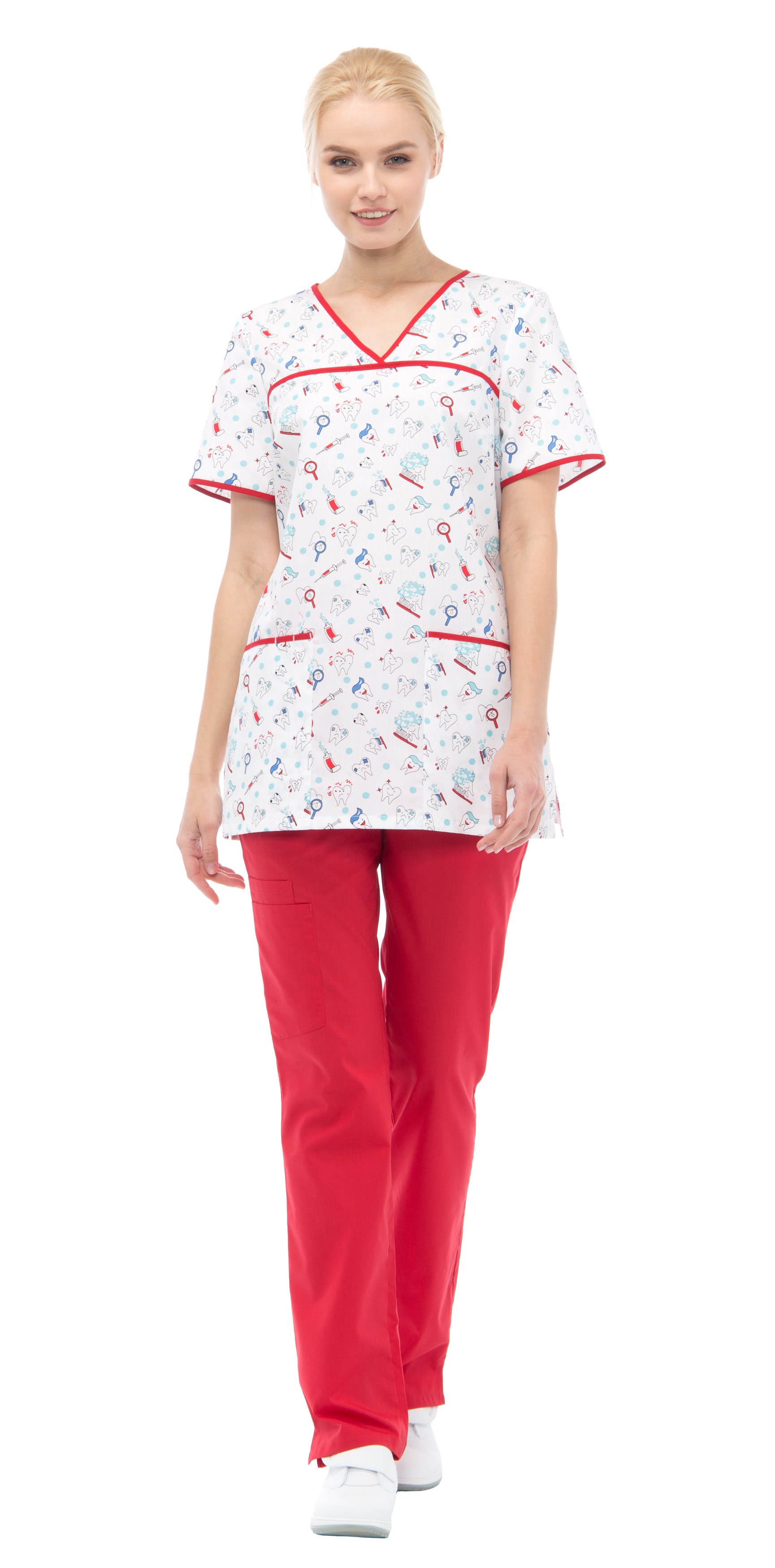Блуза прямого силуэта из принтованной ткани с V-образным вырезом горловины. По переду горизонтальная кокетка над грудью и накладные карманы с отделениями для ручек по низу. Спинка с завязками от боковых швов, из ткани отделки, для регулировки объема по талии. Рукава втачные короткие. По низу боковых швов блузы – разрезы. По горловине, кокетке, верху карманов и по низу рукавов окантовка из ткани отделки.
