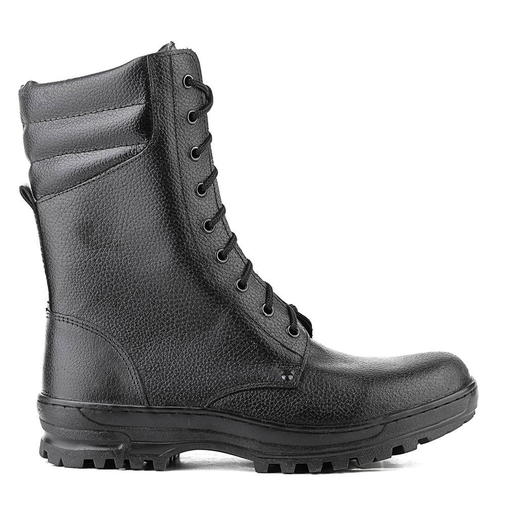 Ботинки высокие изготовлены методом приклеивания подошвы к заготовке верха обуви. Имеется пристроченная задинка. Верх ботинок изготовлен из кожи. Подкладка ботинок выполнена из материала спандбон. В верхней части ботинок выполнен мягкий кант. На внешней задней части выполнен задняя петля для удобства надевания. Ботинки завязываются на шнурки и имеют полуглухой клапан. Шнуровка производится с использованием металлических люверсов и крючков (в верхней части, по два крючка с правой и левой сторон). Стелька вкладная. Внутри ботинка в пяточной части имеется вставка (задний внутренний карман) из микрофибры. В носочной части стопы выполнен термопластичный подносок. Подошва из материала ТЭП (термоэластопласт). Глубина профиля (протектора) ходового слоя подошвы составляет 6 мм. Цвет ботинок - черный.