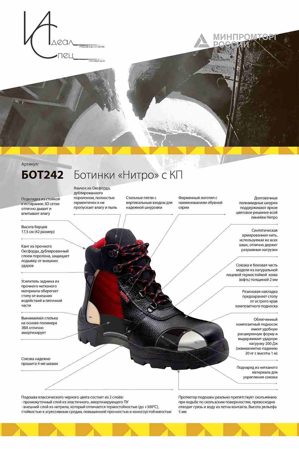 Подошва: ПУ-Нитрил, двухслойная, внутренний слой из облегченного и амортизирующего полиуретана, ходовой слой из нитрильной резины, обладает повышенной прочностью, защищает от кратковременного воздействия с нагретыми поверхностями (до +300), и обеспечивает защиту от агрессивных сред (МБС, КЩС), имеет специальный протектор, эффективно препятствующий скольжению, глубина протектора составляет 4,5-5,0 мм.