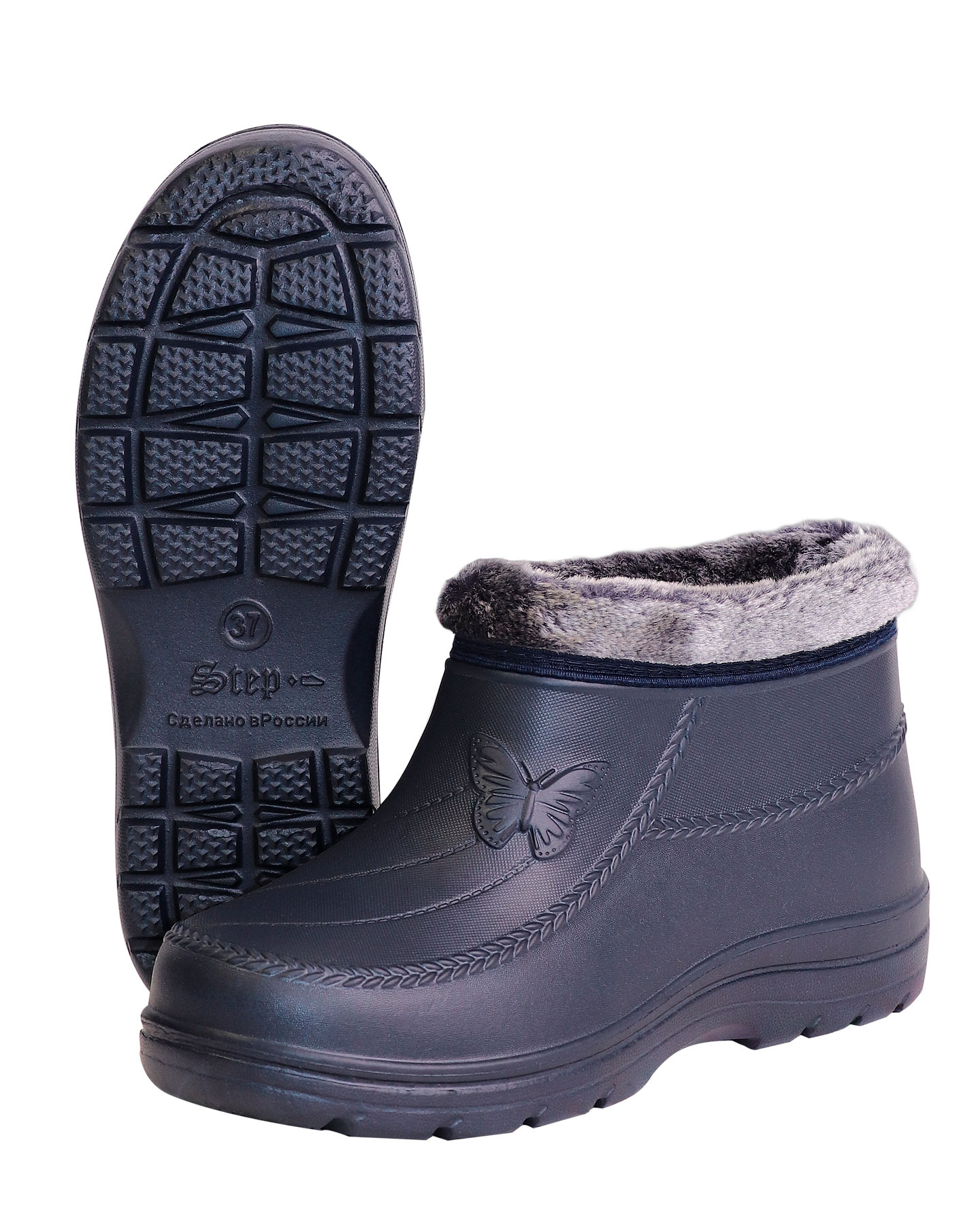 Боты сделаны из непромокаемого материала ЭВА - материал легкий, упругий, морозостойкий, обладает низкой теплопроводимостью и не впитывает влагу. Утепленная вставка дает дополнительную защиту от холода.