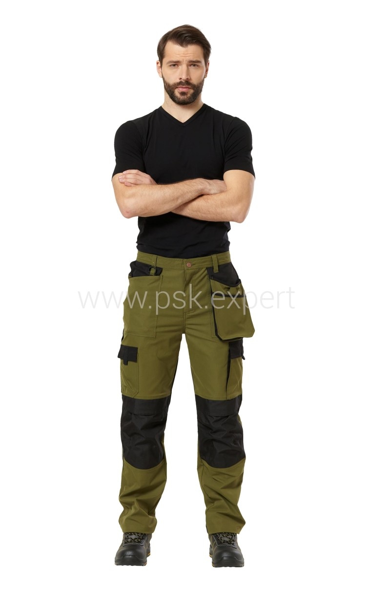 Брюки летние и демисезонные из плотной смесовой ткани сдержанного цветового сочетания хаки и черного, для защиты от общих производственных загрязнений.