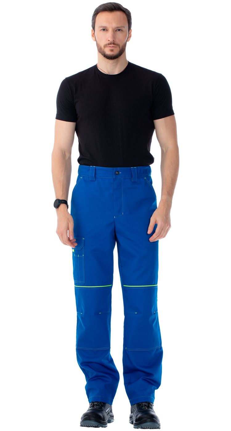Брюки с гульфиком с застежкой на петли и пуговицы. Пояс со шлевками для ремня и с эластичными вставками по бокам для регулировки объема. На передних половинках - верхние карманы с боковым входом, на задних половинках - верхние накладные карманы с объемом в нижней части, левый карман с клапаном. На правой брючине на уровне середины бедер - накладной карман с клапаном и малым накладным карманом с отделениями для мелких инструментов. Усилительные накладки в области коленей и карманы для амортизационных вкладышей под ними.