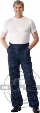 Брюки с заст.жкой спереди на 3 петли и 3пуговицы, с притачным поясом с 5 шлевками и заст.жкой на 1 петлю и пуговицу, с накладными боковыми карманами с наклонным входом, с накладным фигурным карманом и двумя (расположенными один на другом) накладными фигурными кармашками для инструментов на правой задней половинке. На маленьком кармашке 2 наклонные петли.