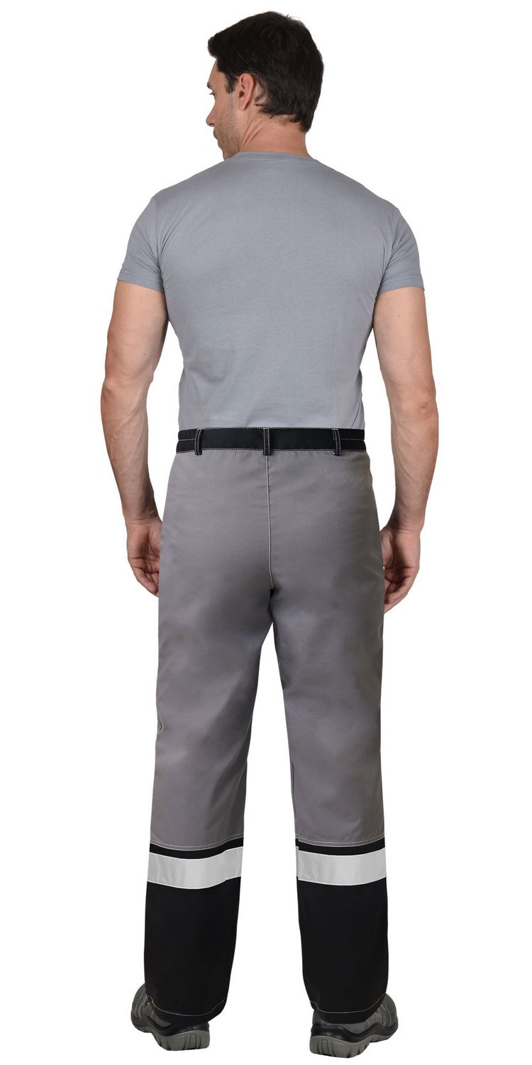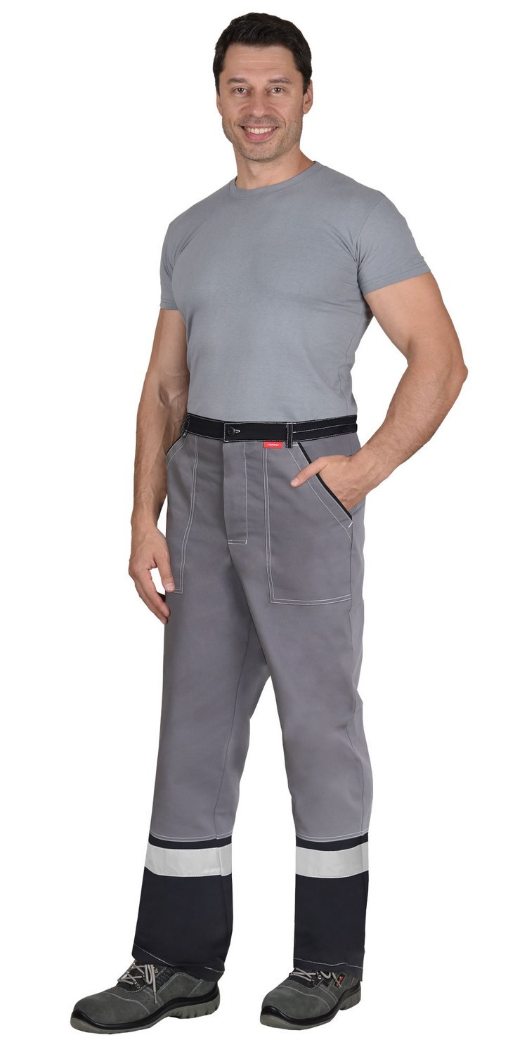 Брюки прямые комбинированные, выполнены из ткани двух цветов, с застежкой гульфика на пуговицы спереди. Изделие с притачным поясом, частично стянутым резинкой и накладными боковыми карманами.