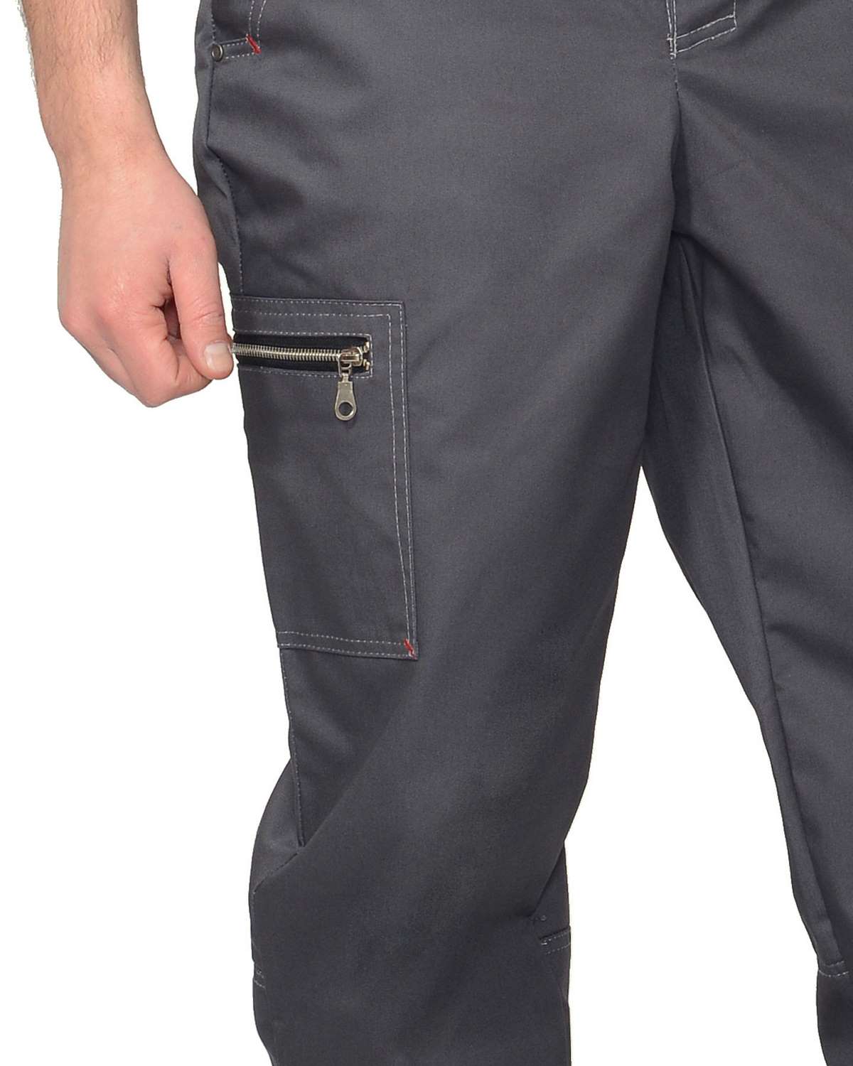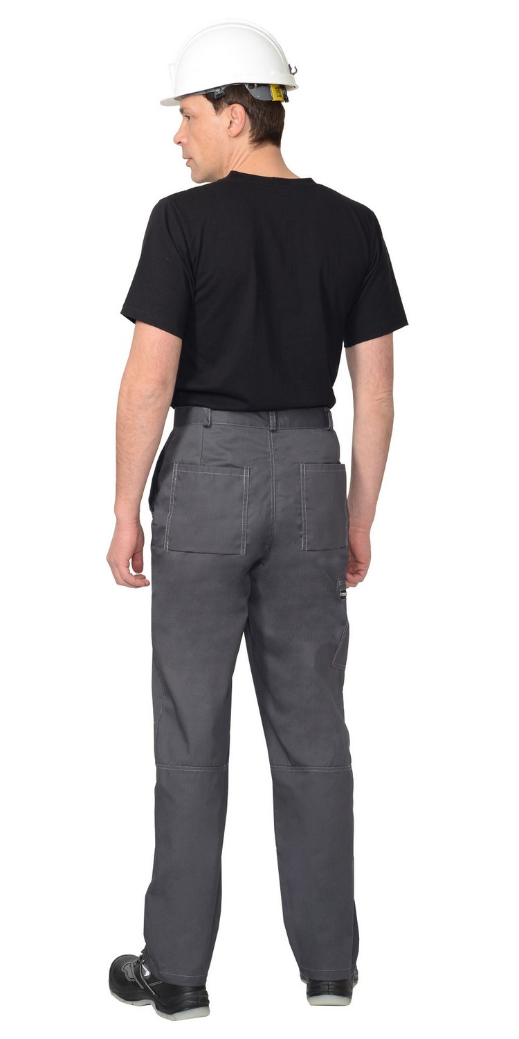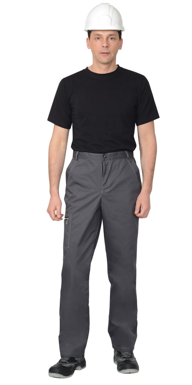 Брюки прямого покроя; с центральной застежкой гульфика на тесьму - «молния», с притачным поясом, застёгивающимся на кнопку; Передние половинки с внутренними боковыми карманами с наклонным входом, нижние углы карманов закреплены закрепками отделочными нитками и хольнитенами. Задние половинки с двумя накладными карманами с нижним объемом. На правом боковом шве брюк настрочен карман, с горизонтальным входом в карман, застёгивающийся на металлическую тесьму «молнию».