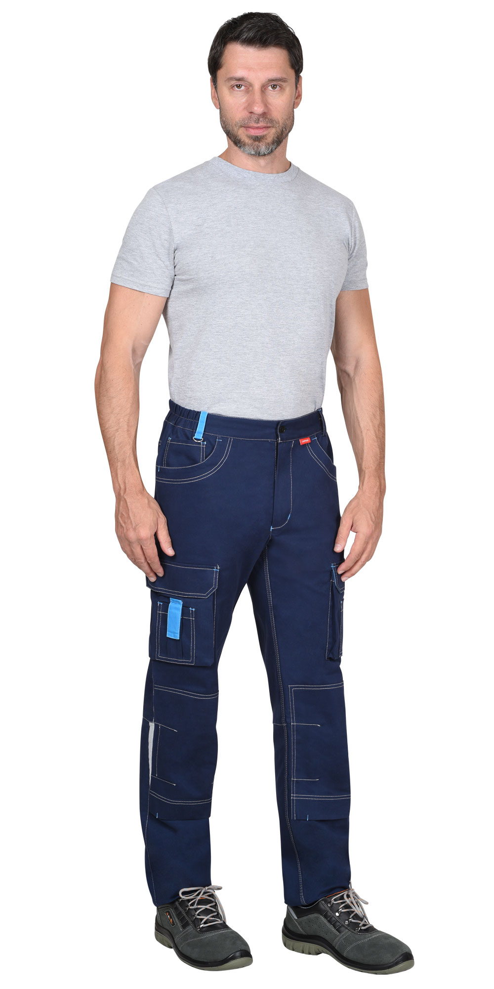 Брюки прямого силуэта с контрастной отстрочкой, с застежкой гульфика на молнию YKK и пуговицу, с карманом с фигурным входом и часовым карманом на правой половинке. На боковых швах накладные объемные карманы с фигурным клапаном на липучке. Изделие с объемными наколенниками с карманом для амортизационных накладок и застежкой на липучке по нижнему краю. Брюки с задними накладными фигурными карманами, отрезной кокеткой, с притачным поясом, частично стянутым резинкой ткацкой по боковым сторонам для лучшего прилегания. На поясе шлевки, одна из которых контрастного цвета с полукольцом для карабина.