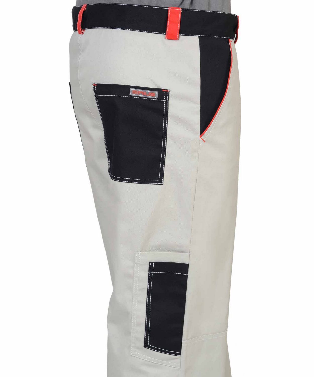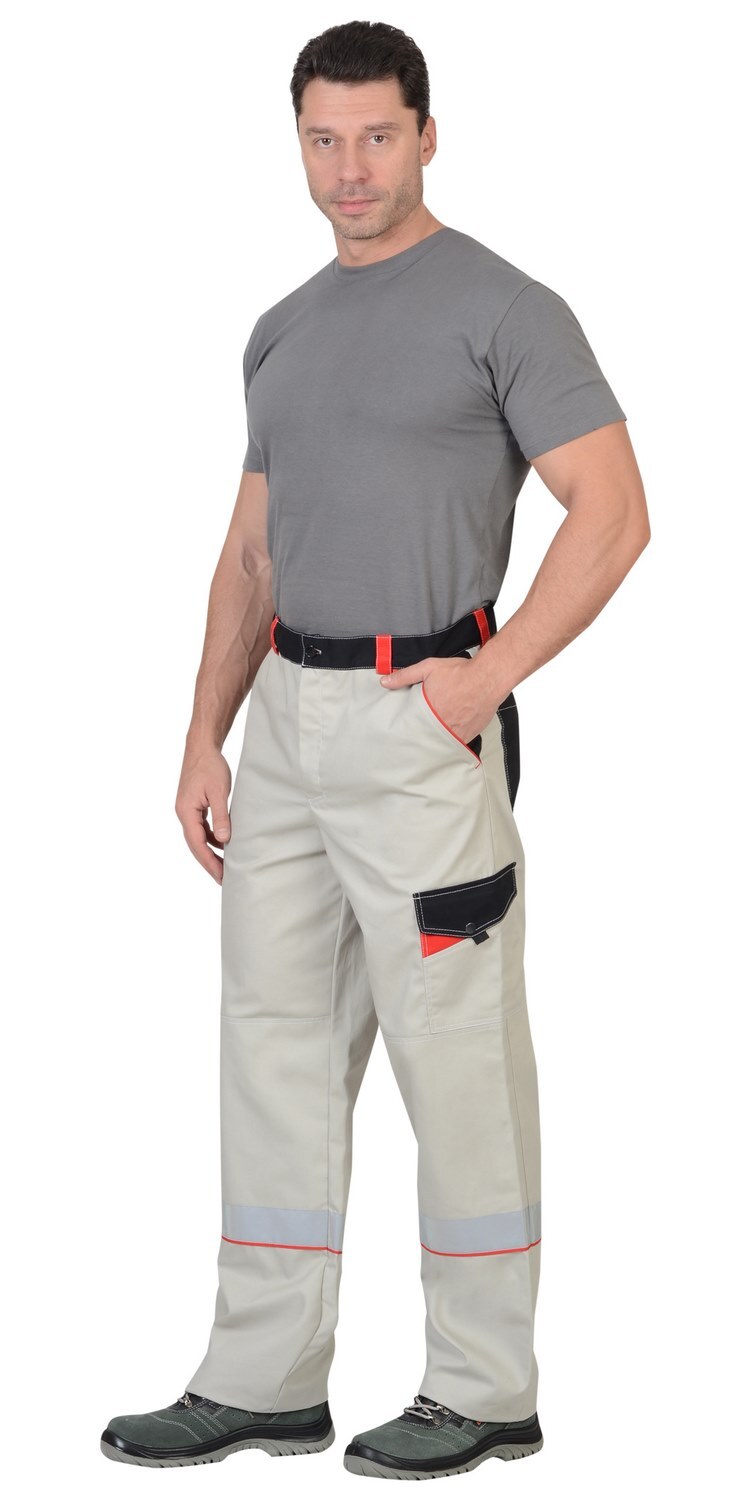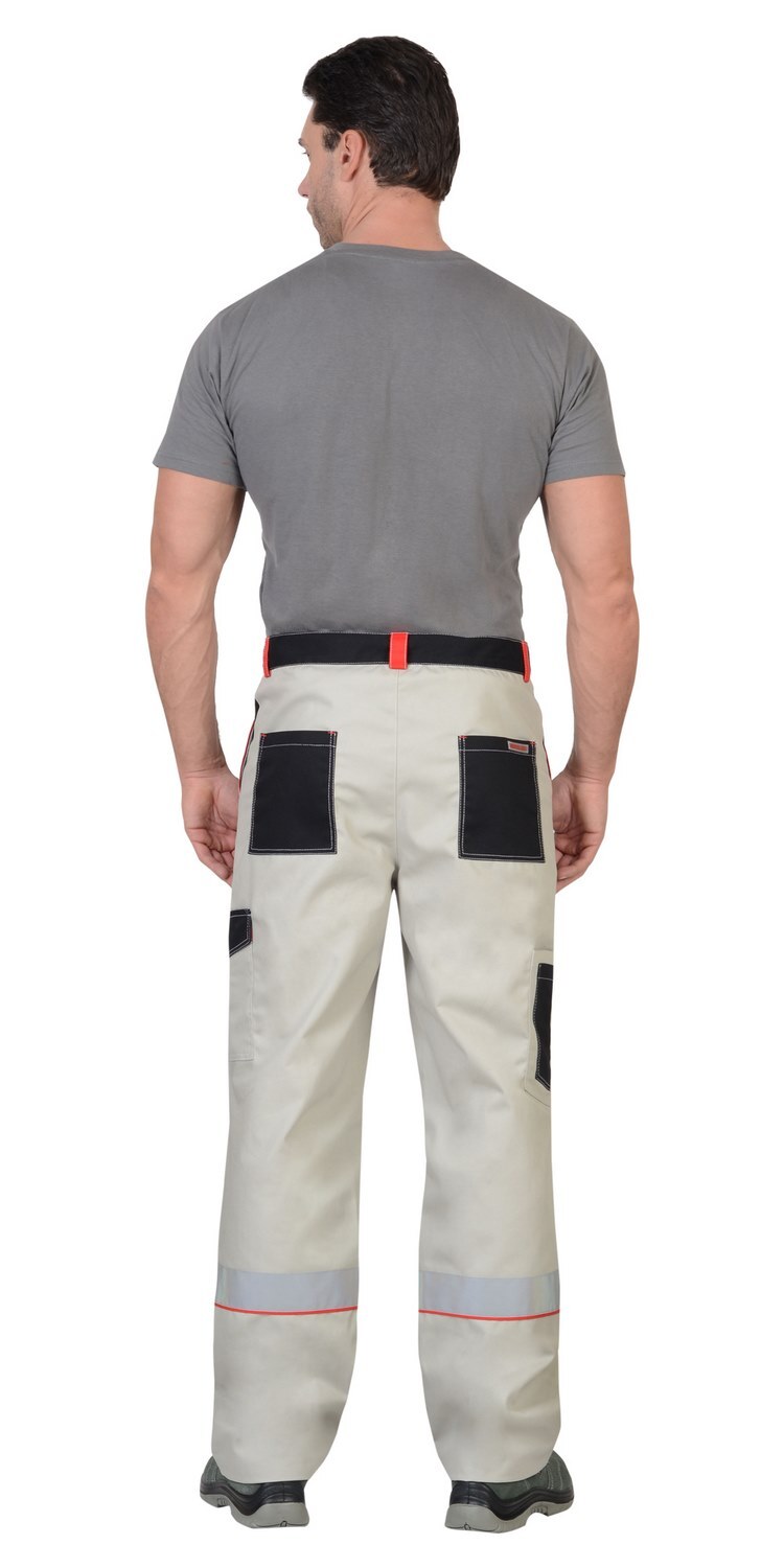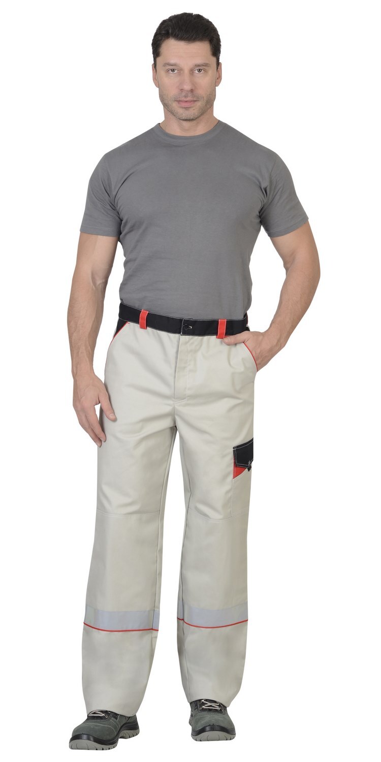 Брюки прямые, с застёжкой гульфика на "молнию", с притачным поясом, с частичной стяжкой по бокам на резинку, с внутренними боковыми карманами и наколенниками, с накладным карманом на левом боковом шве с клапаном, с двумя задними накладными карманами и карманами для инструментов. В брюках предусмотрен СОП шириной 50 мм для обозначения сигнальной видимости.
