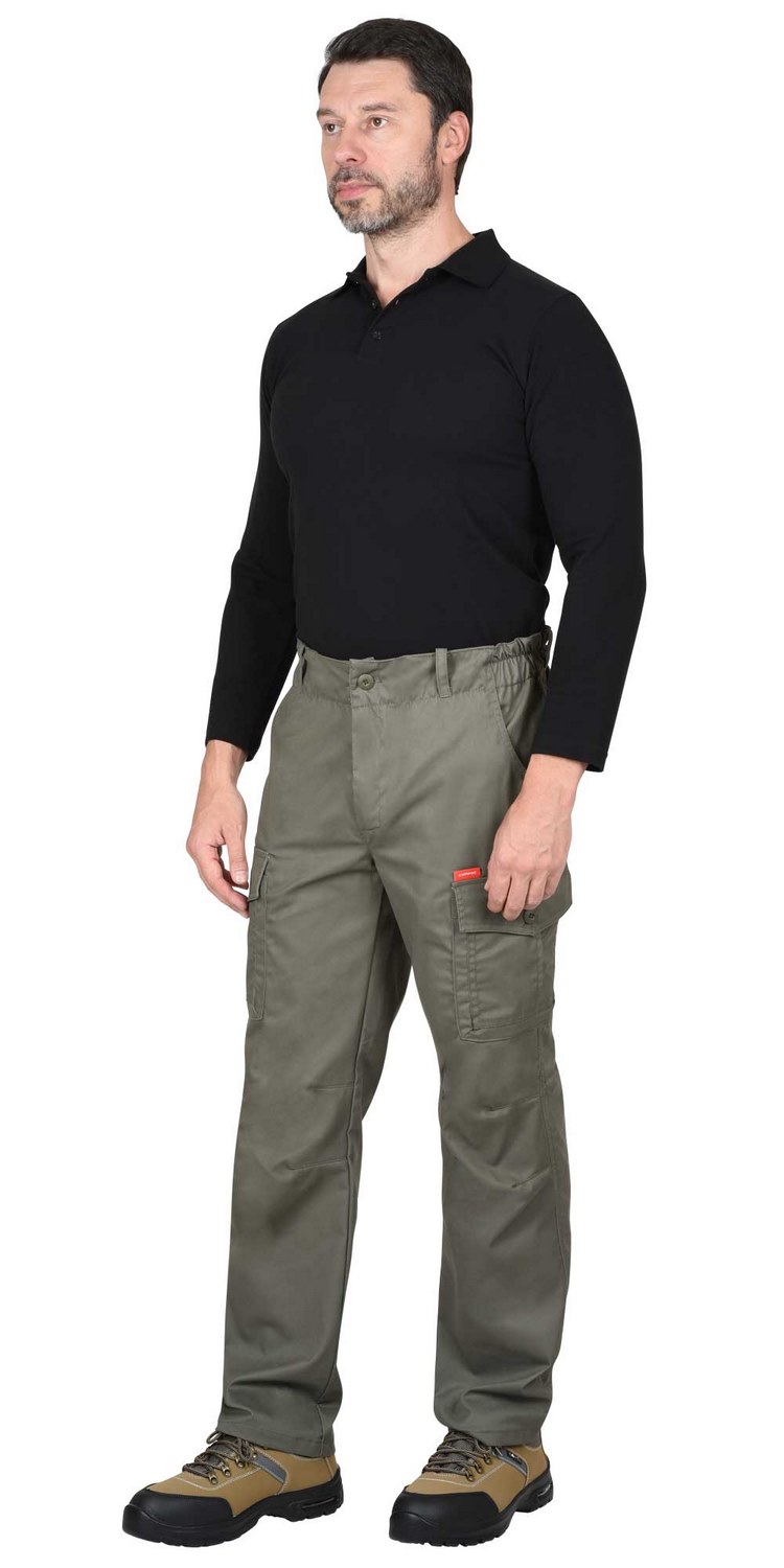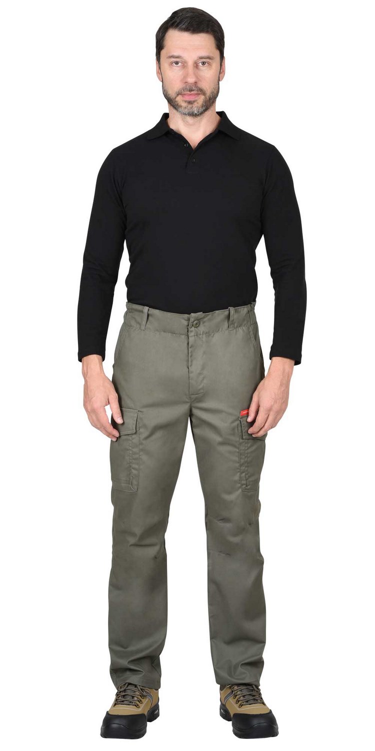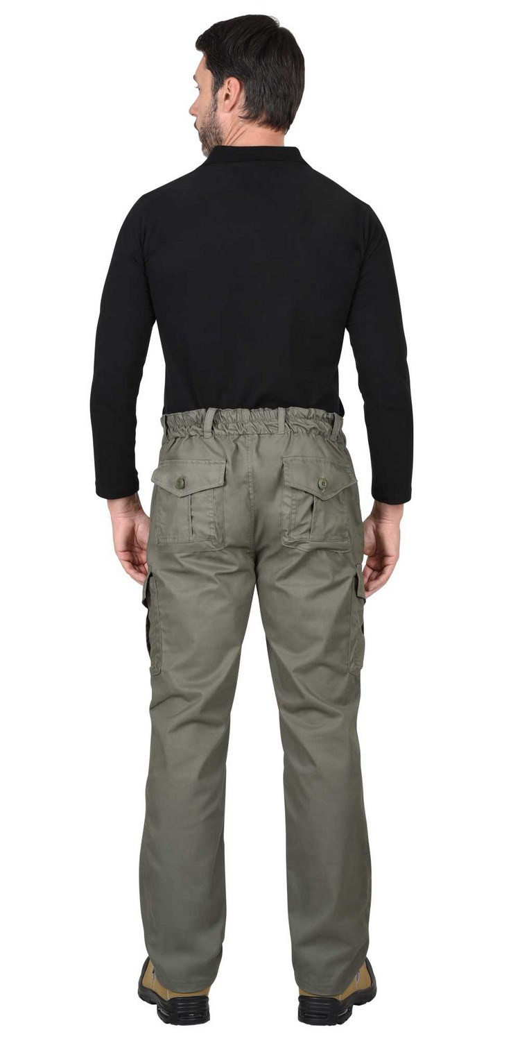 Брюки прямые с застежкой гульфика на молнию, цельновыкроенным поясом, частично стянутым резинкой и различными многофункциональными карманами.