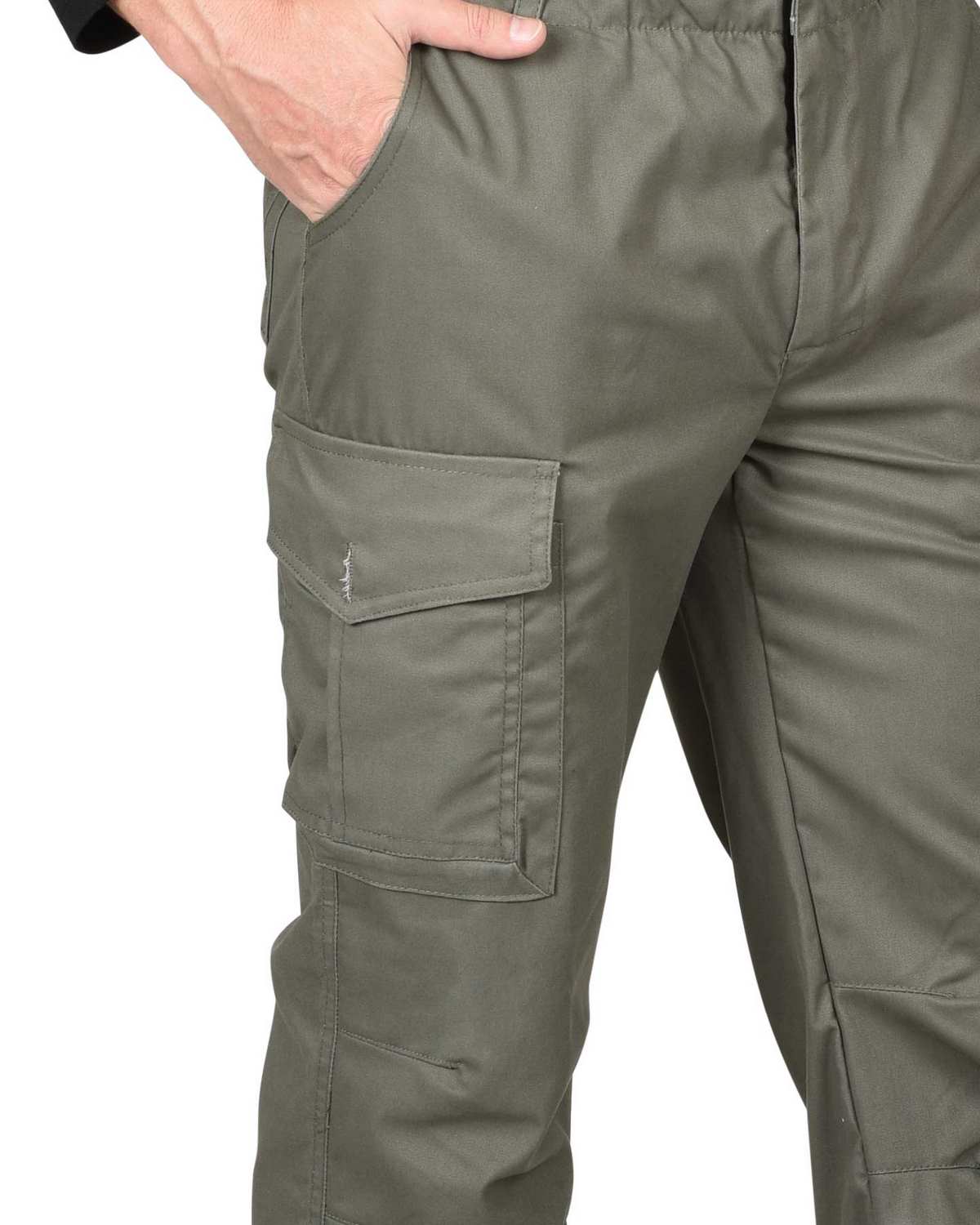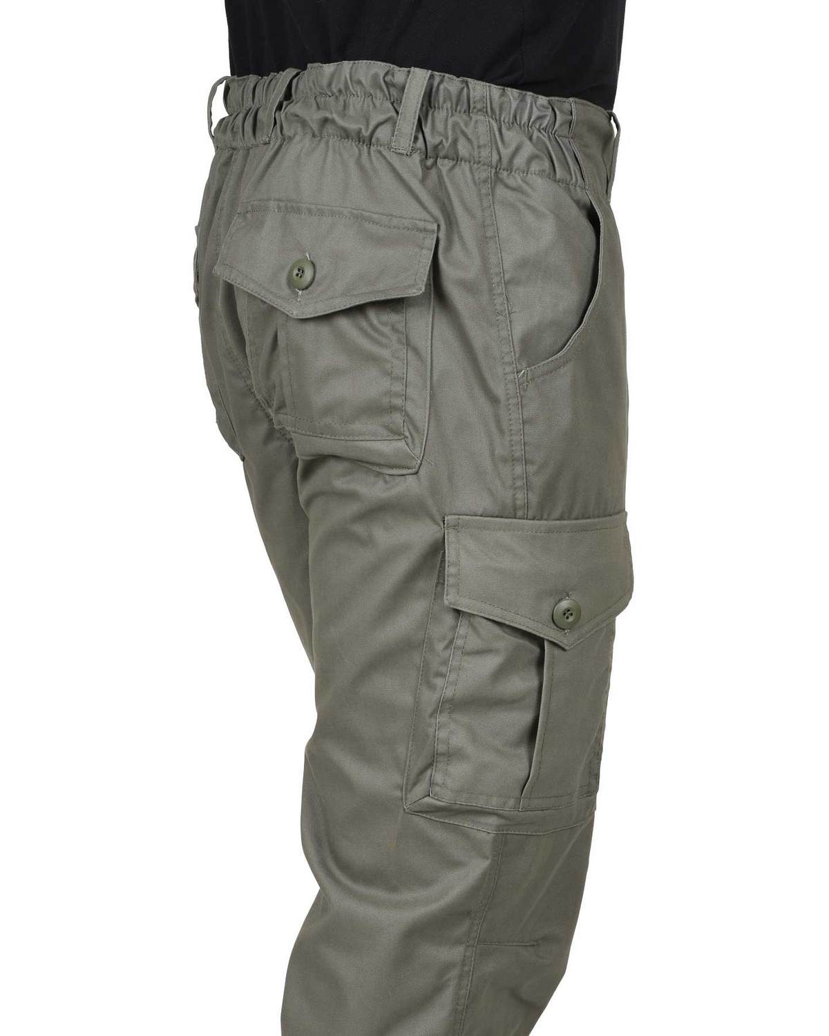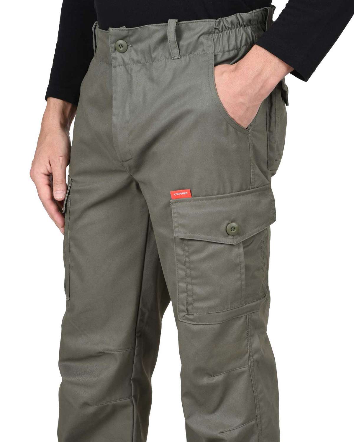 Брюки прямые с застежкой гульфика на молнию, цельновыкроенным поясом, частично стянутым резинкой и различными многофункциональными карманами.