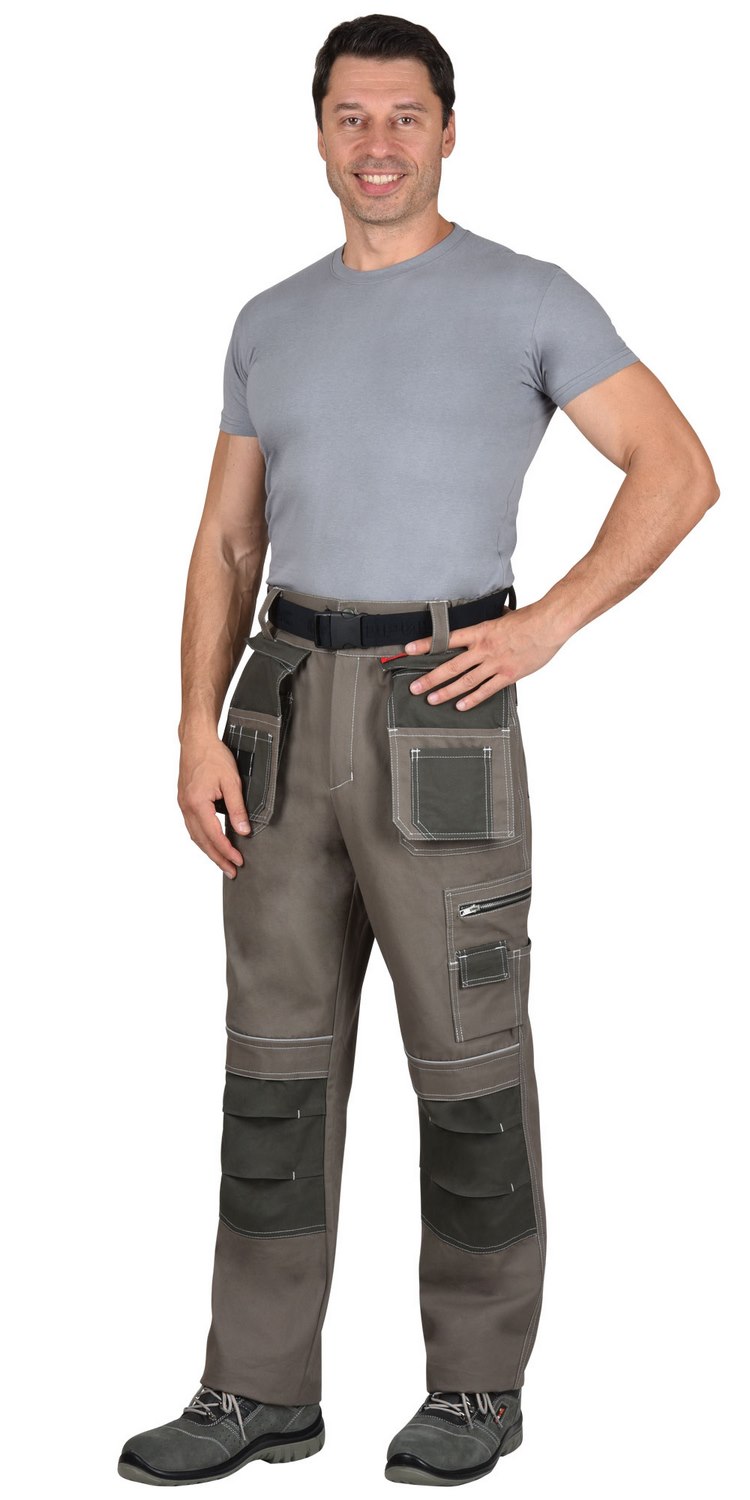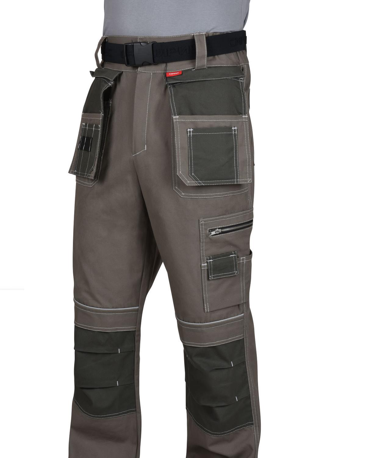 Брюки прямого силуэта, с притачным поясом, с застежкой гульфика на тесьму – «молния», с различными многофункциональными карманами и объёмными наколенниками. В брюках предусмотрен ремень из резинки ременной «Сириус» застегивающийся на защелку-фастекс.