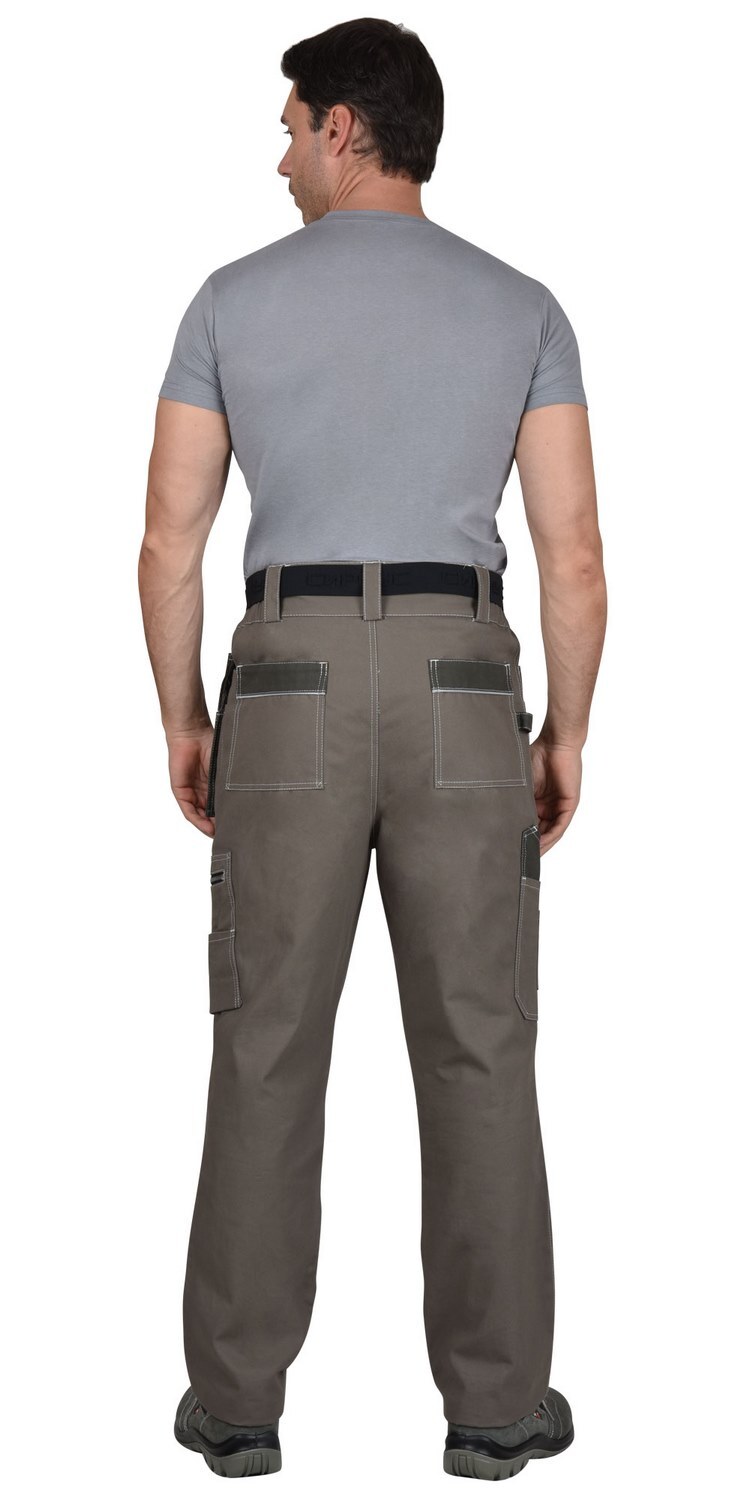 Задние половинки с накладными карманами и патой для инструментов. Пояс широкий, застегивается на 2 пуговицы, с резинкой по боковым швам.