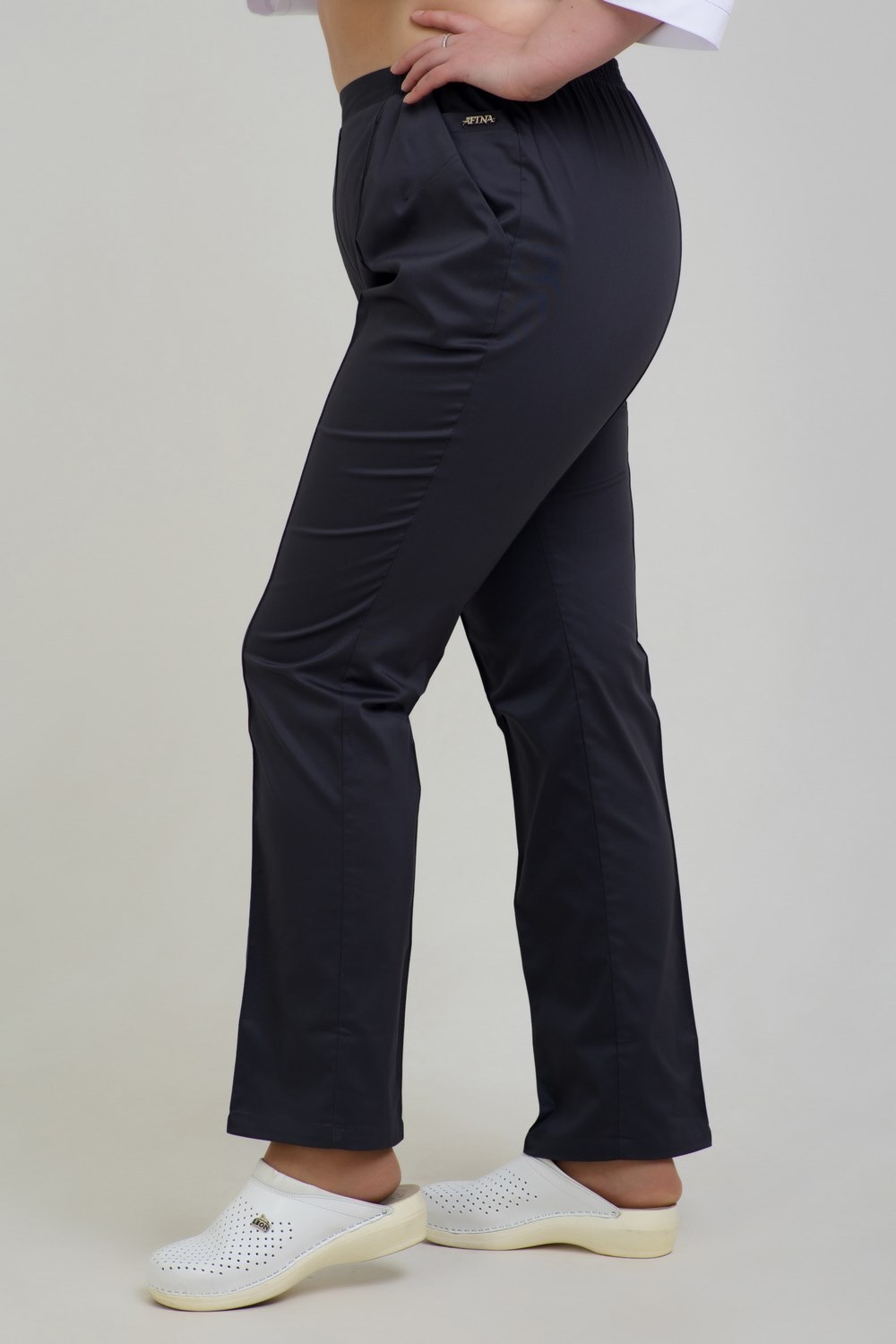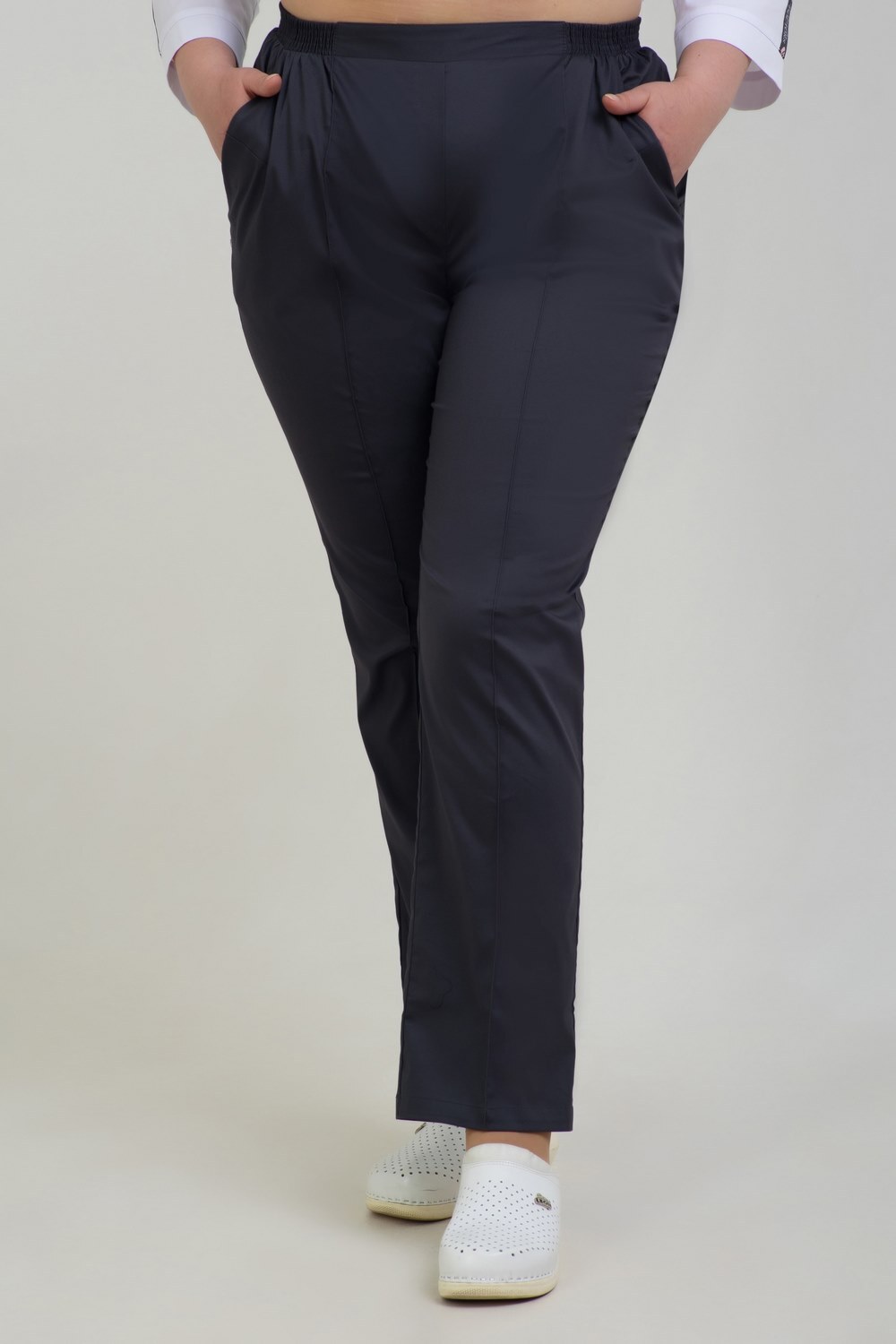 Брюки женские, слегка зауженные к низу, на притачном поясе, в среднем шве передних половинок отстрочка, имитирующая застёжку.