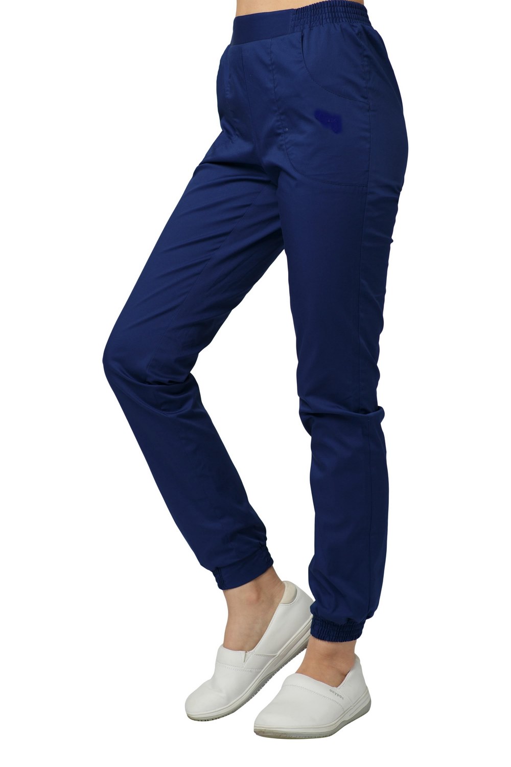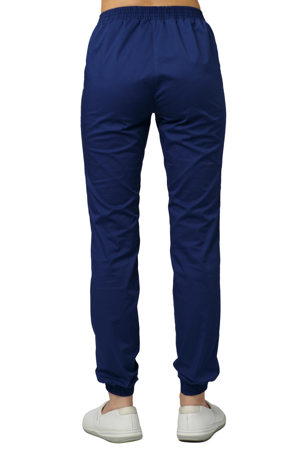 Брюки женские, зауженные к низу, на притачном поясе со вставкой посередине и с продернутой эластичной резиной.
