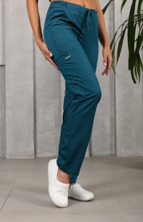 На передних половинках боковые карманы от пояса до бокового шва. На правой штанине по боковому шву настрочен накладной фигурный карман, переходящий на заднюю половинку.