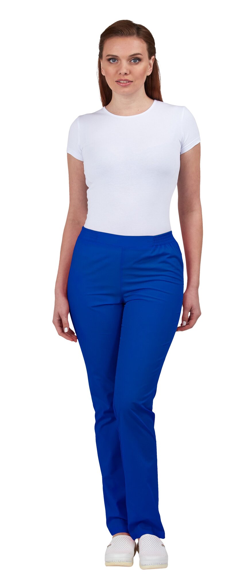 Брюки женские умеренного объема с притачным поясом на эластичной тесьме.