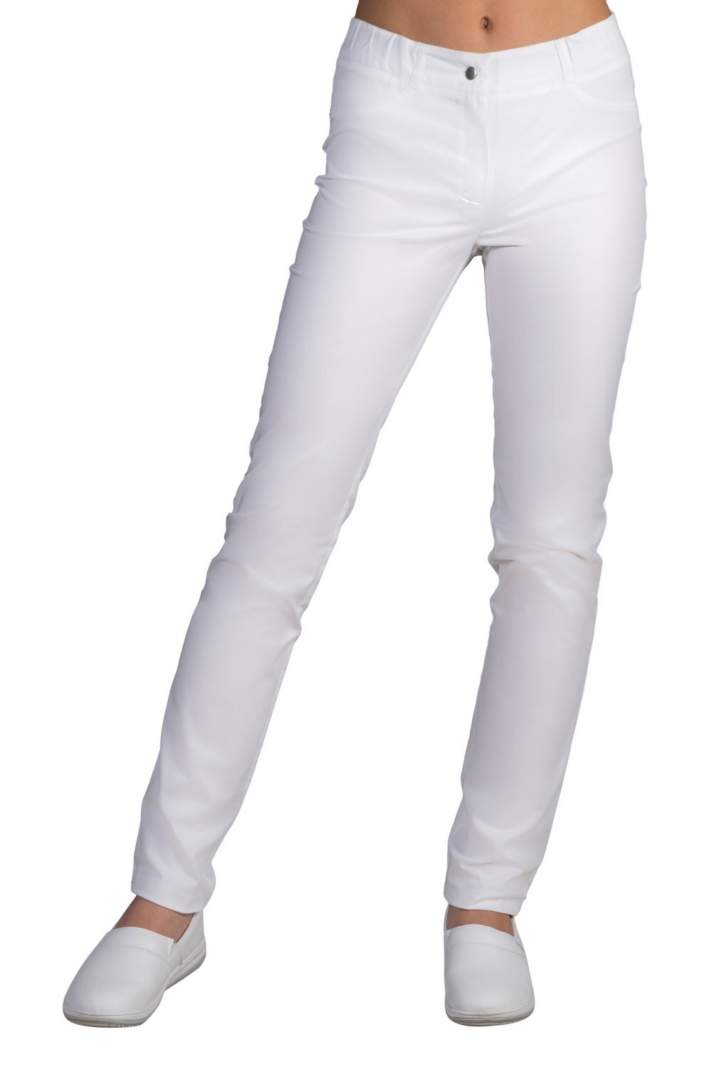 Брюки женские, зауженные к низу с застежкой гульфик на молнии по центральному шву, отрезным поясом, с застежкой на закрытую кнопку.