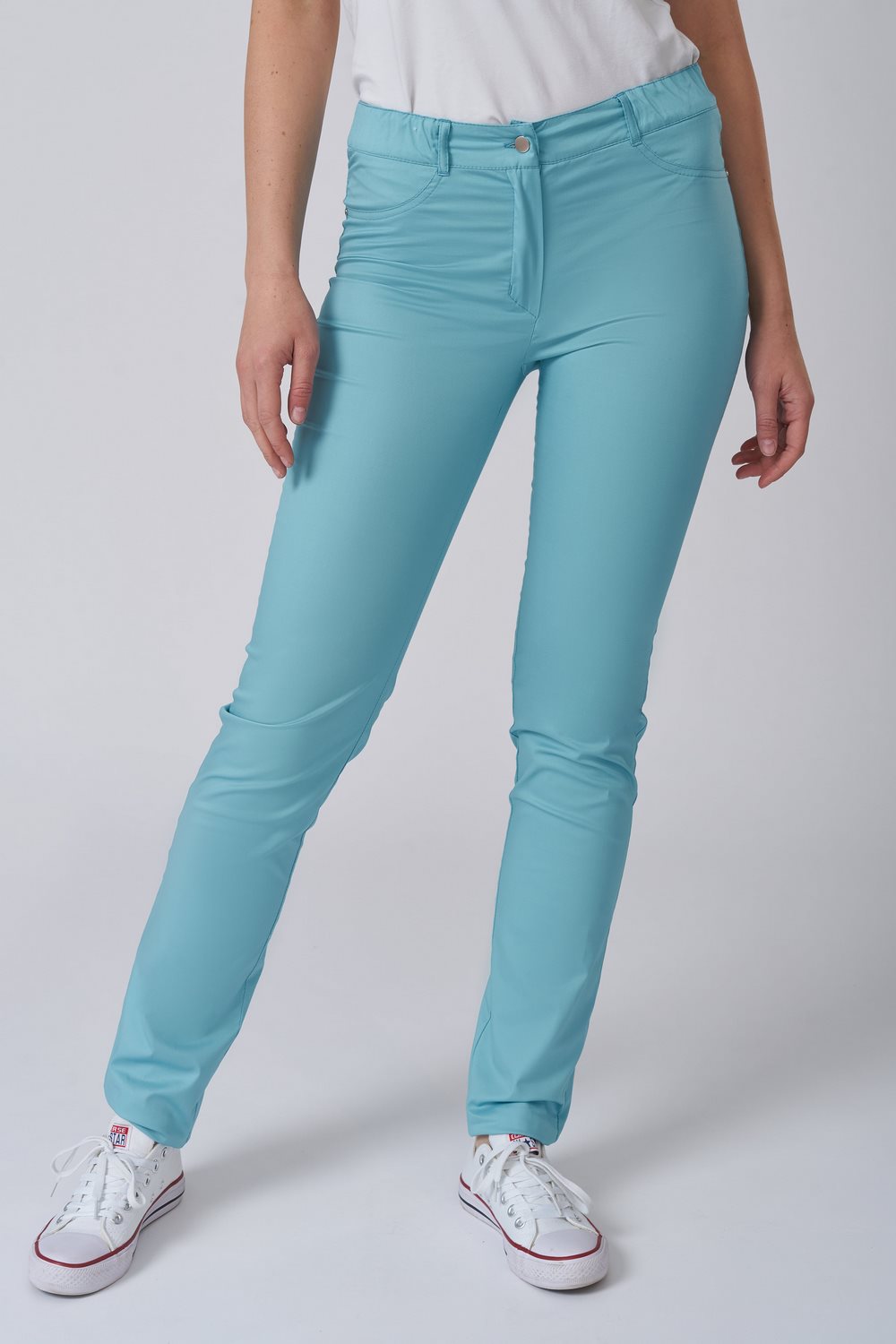Брюки женские, зауженные к низу с застежкой гульфик на молнии по центральному шву, отрезным поясом, с застежкой на закрытую кнопку.