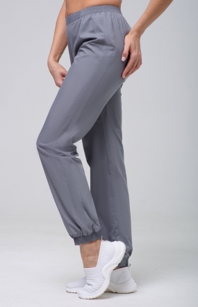 Брюки женские, зауженные к низу, на притачном поясе со вставкой посередине и с продернутой эластичной резиной.