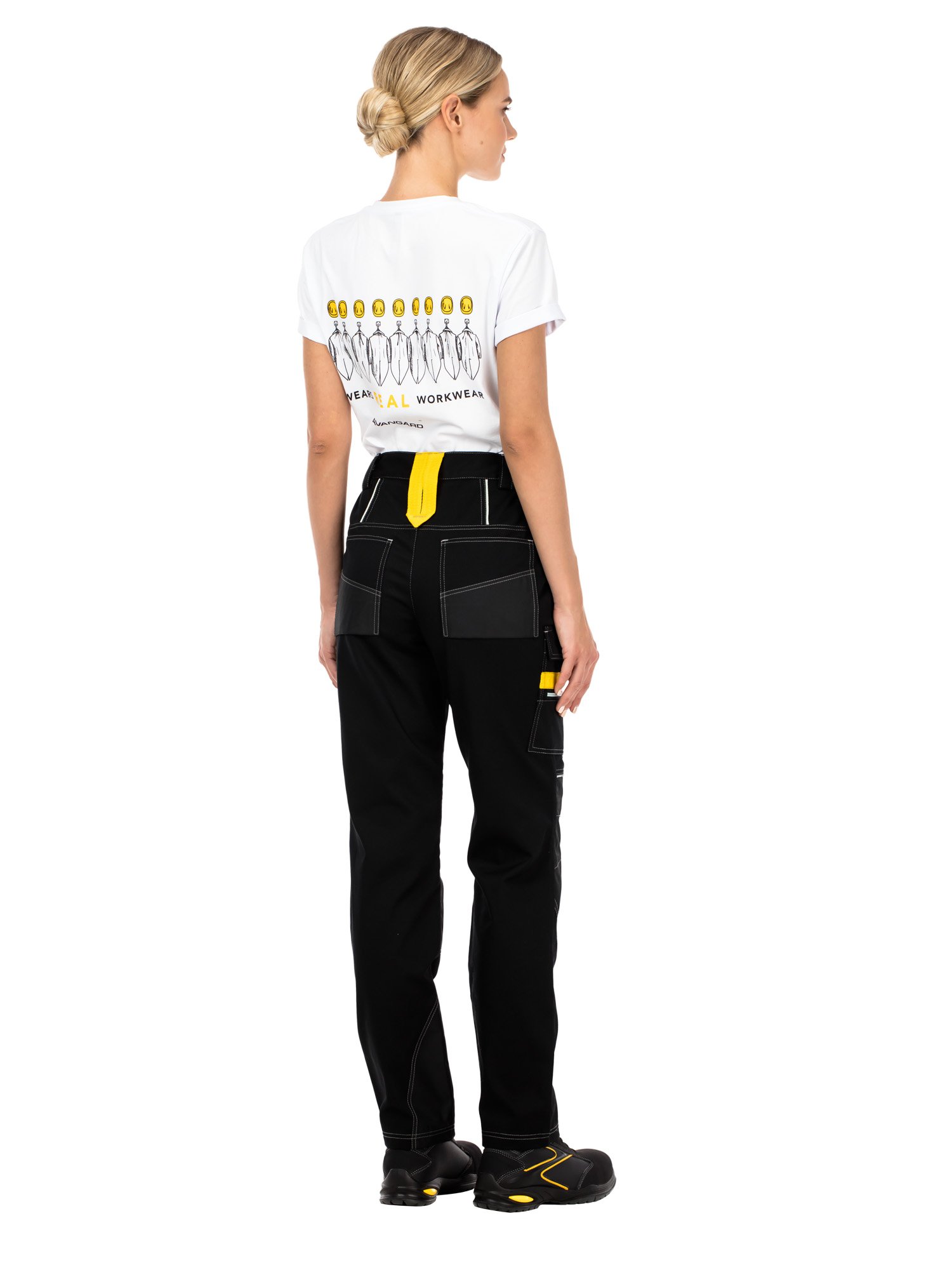 Брюки эргономичной формы с застежкой на гульфик с молнией и джинсовую пуговицу на поясе. Пояс со шлевками для фиксации ремня. Шлевка спереди с пластиковым полукольцом для крепления карабина или пропуска. Сзади - большая шлевка из стропы контрастного цвета. На передних половинках верхние карманы с боковым входом и карманы для амортизационных вкладышей в области колен на липучках. Боковой накладной карман с клапаном на липучке и карманом на молнии для мелких предметов в области середины бедра. На задних половинках кокетки, верхние накладные карманы с объемом в нижней части. Световозвращающие канты для обеспечения безопасности в условиях плохой видимости. В области колен и по низу брюк - накладки из ткани устойчивой к истиранию.