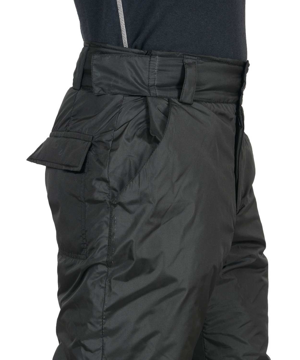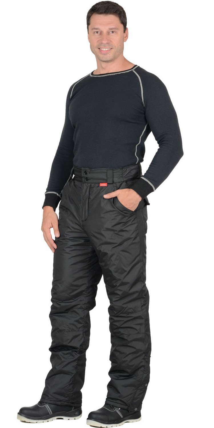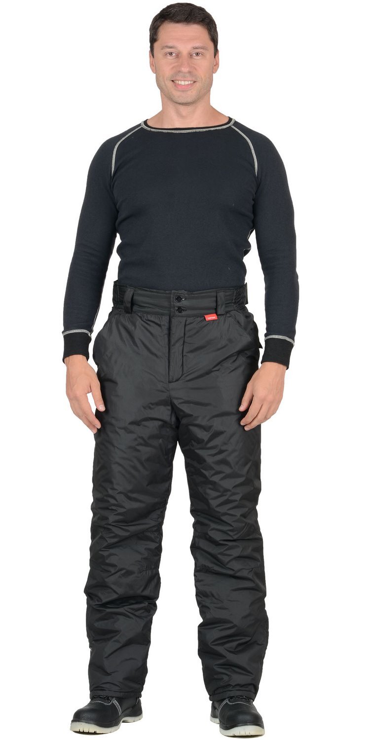Брюки прямые, с притачной утеплённой подкладкой, с застежкой спереди на молнию, с расширенным утеплённым поясом с удобной регулировкой по ширине, с боковыми внутренними карманами спереди и с двумя накладными карманами с клапанами сзади. Внизу боковых швов брюк разрез с молнией и напульсник из подкладочной ткани с эластичной тесьмой.