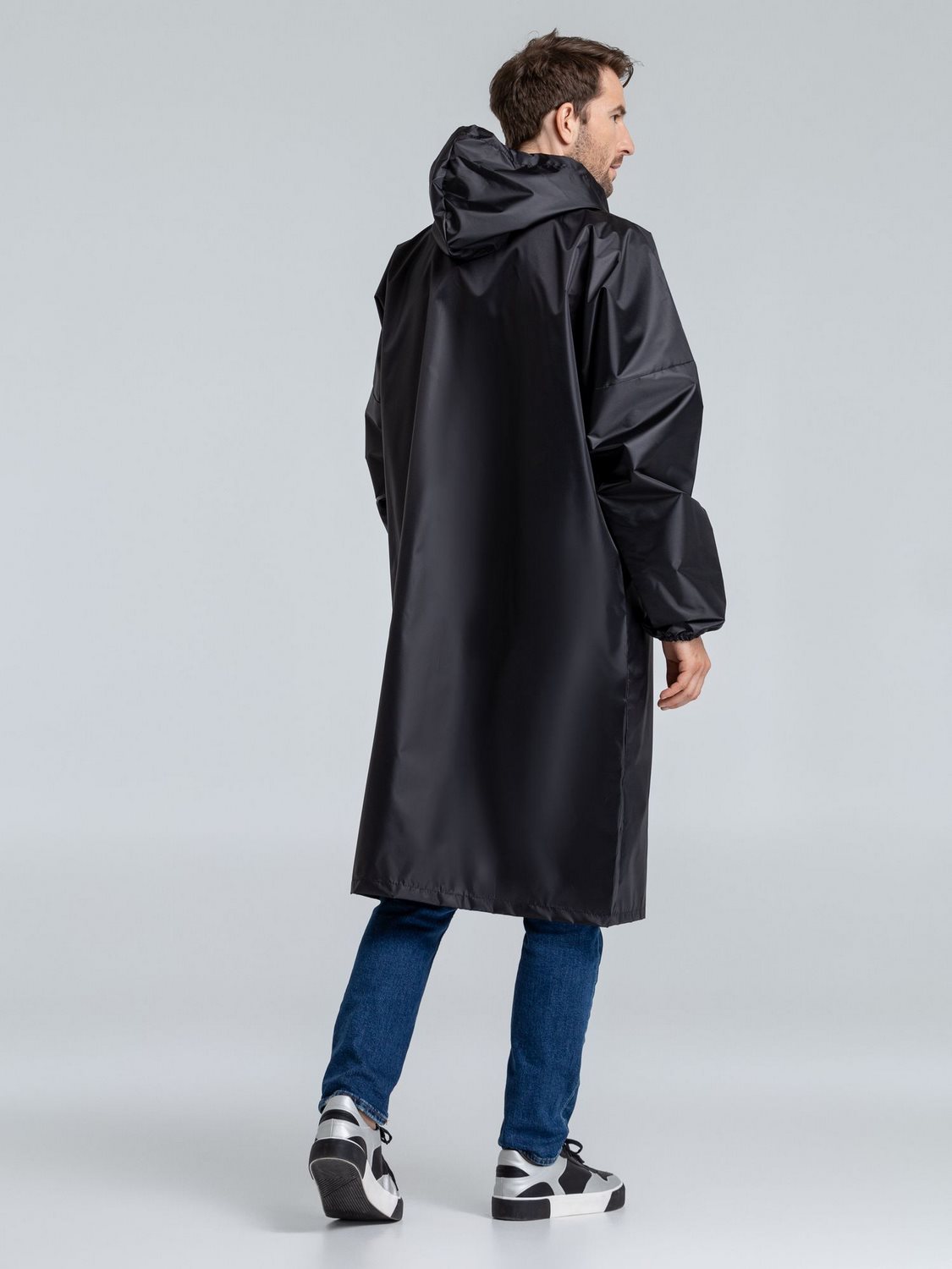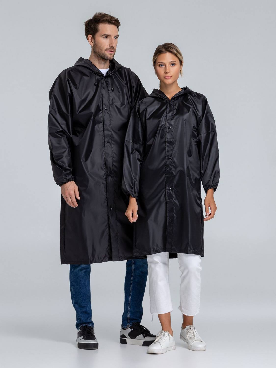 Плащ-дождевик из ткани Оксфорд на кнопках с капюшоном.