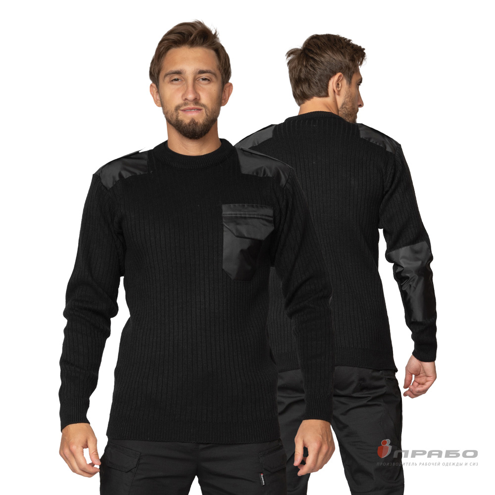 Джемпер форменный для сотрудников охранных предприятий с круглым вырезом и с усилительными накладками в области плеч и локтей, а так же накладной карман и погоны из водоотталкивающей ткани.