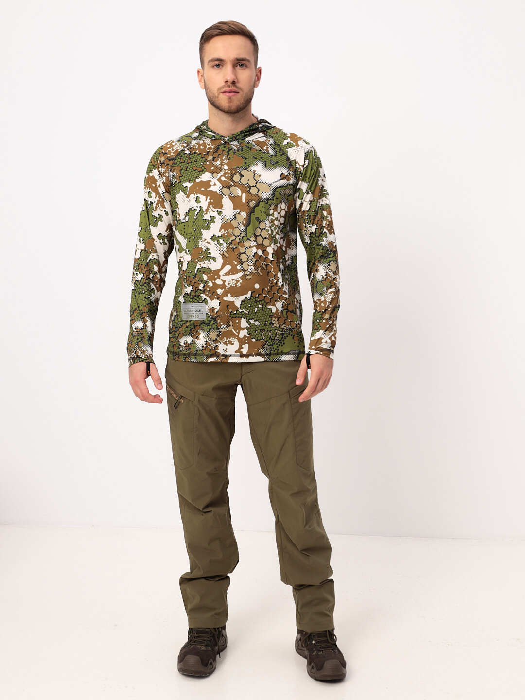 Футболка с длинным рукавом и капюшоном изготовлена из инновационной охлаждающей ткани, защищающая от ультрафиолета и высоких температур ( до + 50С), дарит комфортные условия для владельца.
