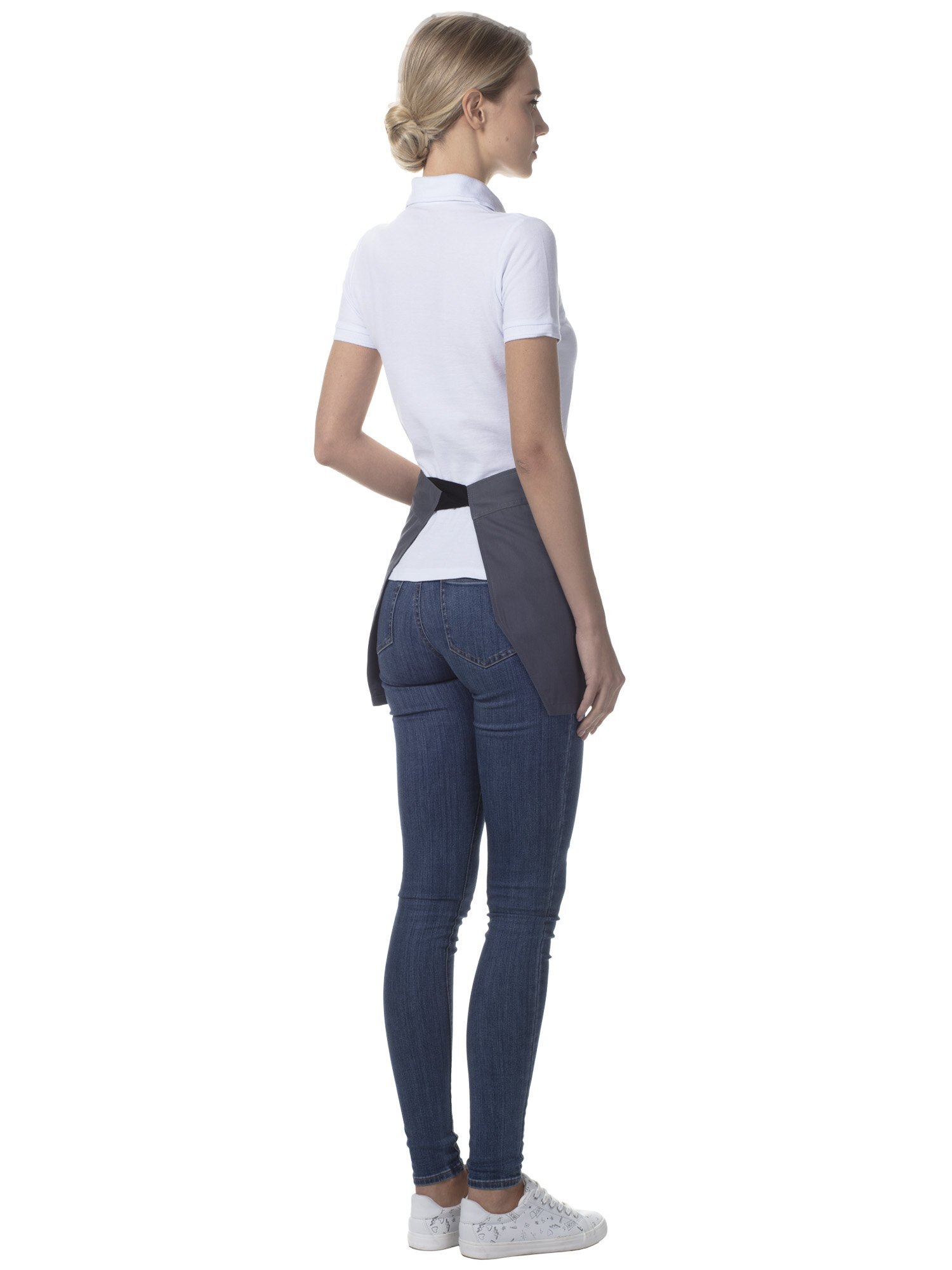 Фартук укороченный, без грудки. Завязывается вокруг талии полупоясами из тесьмы. По центру большой накладной карман со входом на молнию и накладной карман с 3-мя отделениями, в том числе с отделением для ручки. Сбоку на кнопки пристёгивается хлястик из искусственной кожи для полотенца.