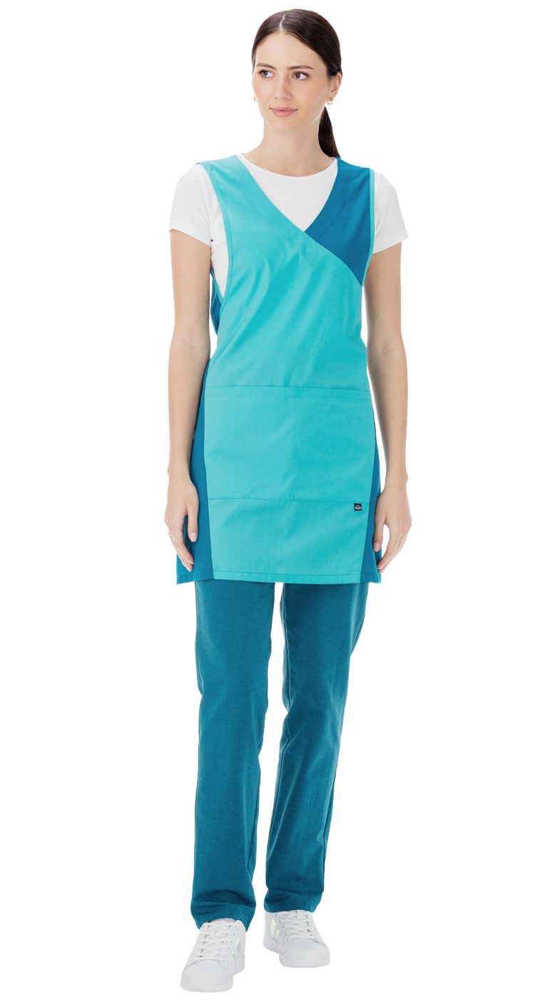 Фартук-сарафан средней длины с V-образной горловиной. Фартук состоит из передней и задней частей, завязывается вокруг талии полупоясами. По центру большой накладной карман с 2-мя отделениями.