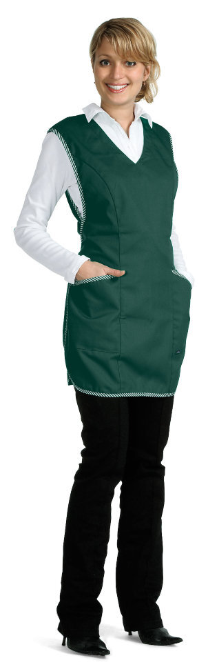 Фартук-сарафан с V-образной горловиной и накладными карманами.