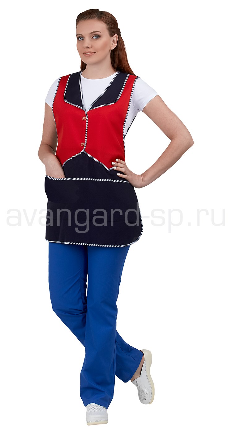 Фартук укороченный, полочка с V-образным вырезом горловины, с воротником, с декоративными деталями из материала контрастного цвета, имитирующими жилет и имитацией застежки на две пуговицы.