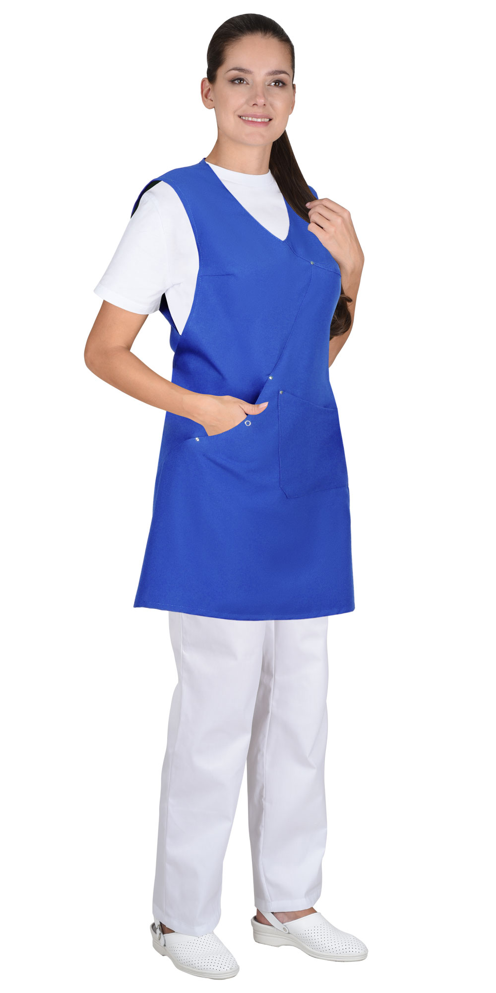 Фартук предназначен для защиты переда и боковых частей работающих от вредных производственных факторов в сфере обслуживания. Фартук с цельновыкроенным нагрудником с V- образным вырезом горловины. В правой боковой части карман застёгивающийся на кнопку. С левой стороны накладной карман с наклонным овальным входом и скошенными нижними углами. Карман разделен на два отделения. Боковые завязки для регулировки фартука на фигуре по объему.