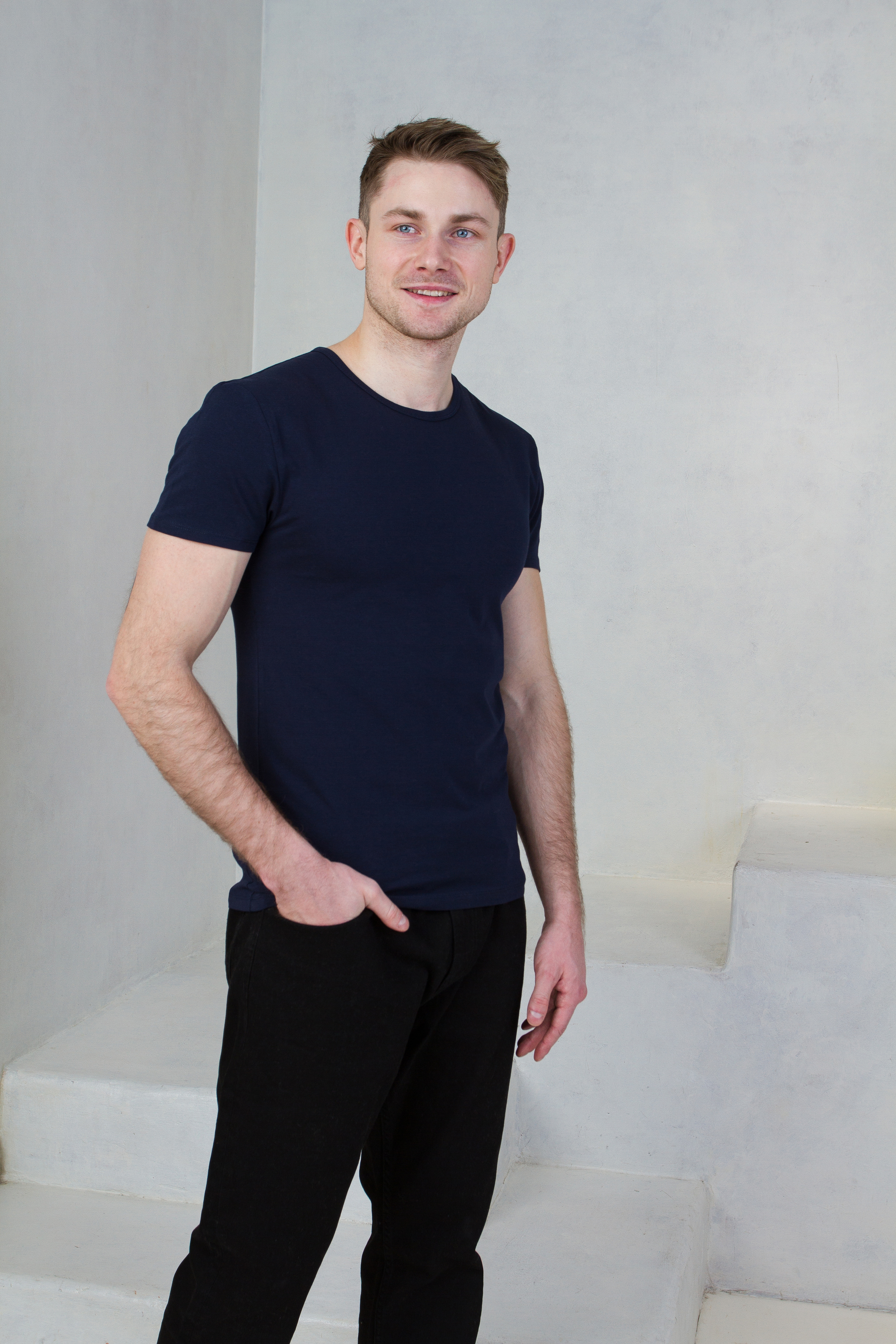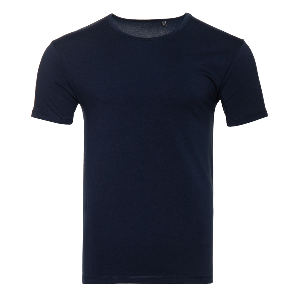 Мужская футболка облегающего силуэта с округлым вырезом и втачным рукавом.