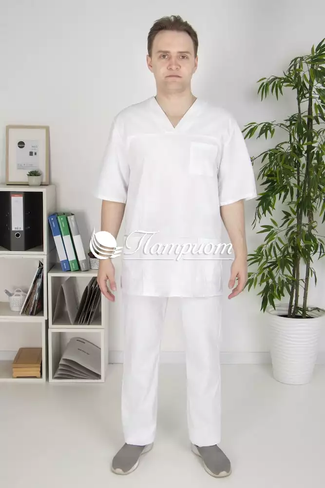 Халат медицинский мужской прямого силуэта, длиной ниже колена.. На полочке один нагрудный и два боковых. На спинке два полупояса из боковых швов с застежкой на пуговицу. Рукава длинные без манжет. Воротник отложной с лацканами. Халат выполнен с центральной бортовой застежкой на пуговицы. Для сборки халата используются нитки в цвет изделия. Выполняется до 62 размера, остальные считаются размерами SIZE + с увеличенной наценкой. Ткань ТИСИ белая 65% полиэстер/35% хлопок плотностью 120 г/м2.ГОСТ 25194-82.