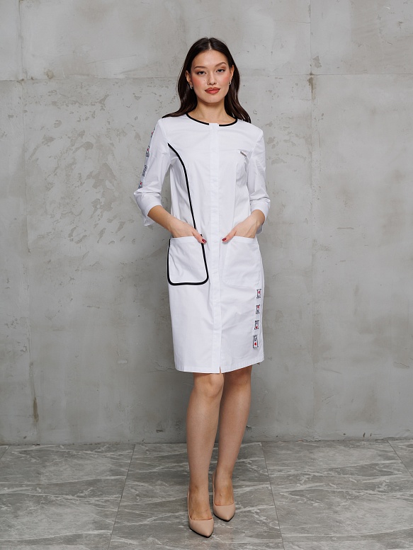 Халат женский, приталенный с застежкой на потайные металлические кнопки. Данная модель имеет боковые накладные карманы. По правой стороне проложен отделочный кант. По левой стороне от кармана расположена деталь с декоративной тесьмой. На груди располежа удобная шлевка для крепления бейджа. Горловина обработана руликом из отделочной ткани. По правому рукаву настрочена деталь с декоративной тесьмой, что придает данной модели особую изюминку.