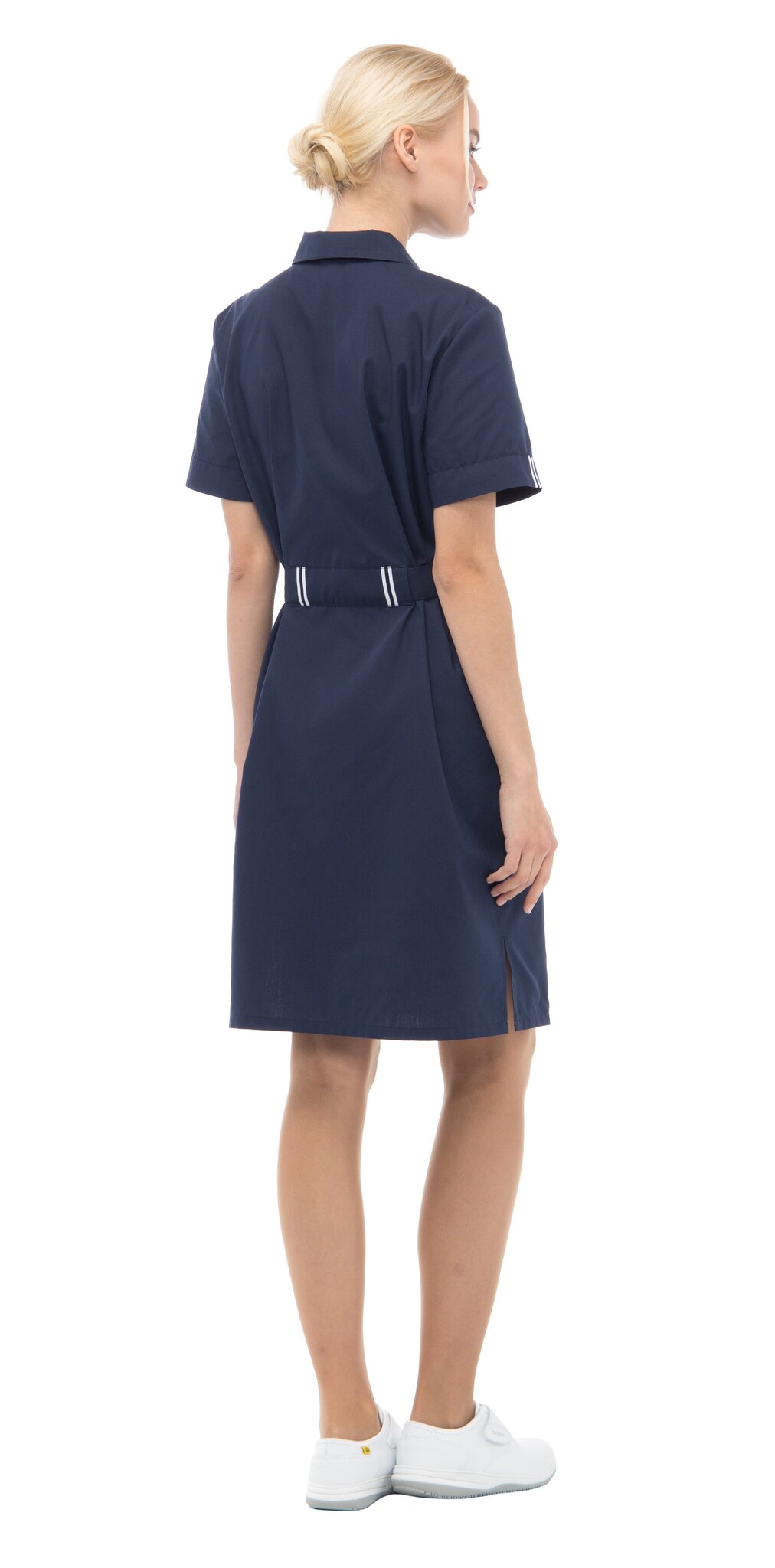 Халат прямого силуэта длиной до колен, с застежкой на молнию и поясом по талии. Вдоль застежки – декоративная тесьма с полосами. Воротник отложной. Нагрудный карман с тесьмой и кольцом для крепления бейджа. Нижние накладные карманы со шлевками для пояса. На спинке длинная шлевка для крепления пояса. Втачные короткие рукава с декоративным отворотом. По низу халата, по боковым швам, небольшие разрезы.