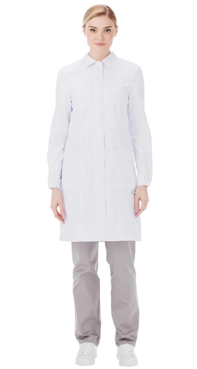 Халат полуприлегающего силуэта. Застежка центральная на потайные кнопки. Воротник отложной. По переду вертикальные рельефы от кокеток. Небольшое прилегание достигается за счет пояса на спинке. В нижней части переда накладные карманы. На изнаночной стороне кокетки потайной карман. По низу среднего шва спинки - шлица. Рукав длинный, с манжетой на резинке и вставкой из основной ткани.