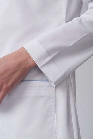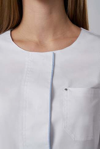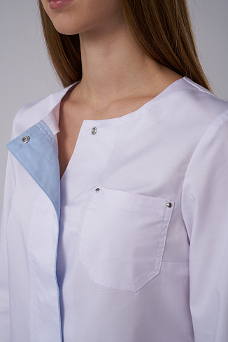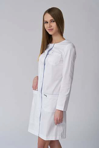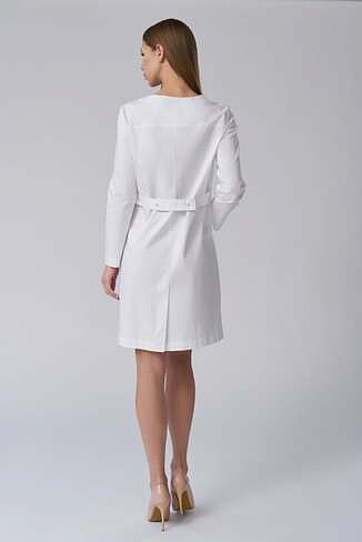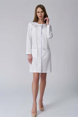 Халат женский, укороченный, прямого силуэта, с потайной застежкой по борту на семь сорочечных кнопок.